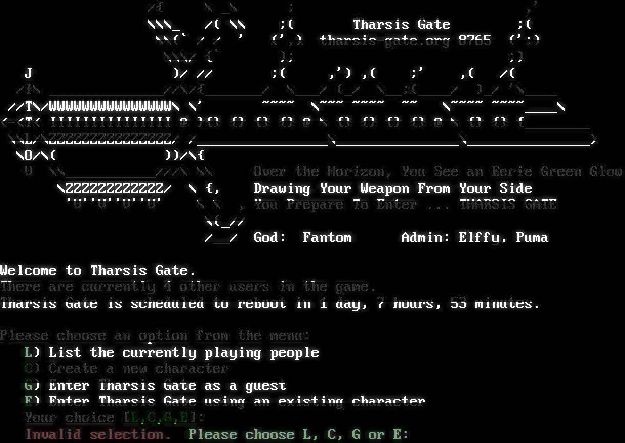 /{ \\ _\\ ; ,' \\\\\\_ /( \\\\ ;( Tharsis Gate ;( \\\\(\` / / ' (',) tharsis-gate.org 8765 (';) \\\\\\/ {\` ); ;) J )/ // ;( ,') ,( ;' ,( /( /I\\ _โ€‹_____________//\\/{_โ€‹______/ \\___/ (_/ \\__;(_โ€‹___/ )_/ '\\_โ€‹___ //T\\/WWWWWWWWWWWWWWW\\ \\' ~โ€‹~~~ \\~~~ ~โ€‹~~~ ~~ \\~โ€‹~~~ ~โ€‹~~~____\\ <-<T< IIIIIIIIIIIIIII @ }{} {} {} {} @ \\ {} {} {} {} @ \\ {} {} {_โ€‹_______ \\\\L/\\ZZZZZZZZZZZZZZZ/ /_โ€‹_______________\\_โ€‹______________\\_โ€‹______________> \\O/\\( ))/\\{ V \\\\_โ€‹__________///\\ \\\\ Over the Horizon, You See an Eerie Green Glow \\ZZZZZZZZZZZZ/ \\ {, Drawing Your Weapon From Your Side 'V''V''V''V' \\ \\ , You Prepare To Enter ... THARSIS GATE \\(_// /__/ God: Fantom Admin: Elffy, Puma Welcome to Tharsis Gate. There are currently 4 other users in the game. Tharsis Gate is scheduled to reboot in 1 day, 7 hours, 53 minutes. Please choose an option from the menu: L) List the currently playing people C) Create a new character G) Enter Tharsis Gate as a guest E) Enter Tharsis Gate using an existing character Your choice [L,C,G,E]: Invalid selection. Please choose L, C, G or E: