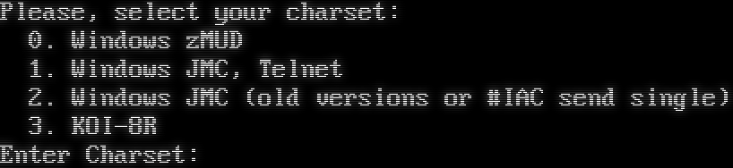Please, select your charset: 0. Windows zMUD 1. Windows JMC, Telnet 2. Windows JMC (old versions or #IAC send single) 3. KOI-8R Enter Charset: