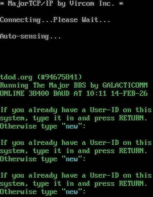 \* MajorTCP/IP by Vircom Inc. \* Connecting...Please Wait... Auto-sensing... ! WELCOME! tdod.org (#94675841) Running The Major BBS by GALACTICOMM ONLINE 38400 BAUD AT 10:11 14-FEB-26 If you already have a User-ID on this system, type it in and press RETURN. Otherwise type "new": If you already have a User-ID on this system, type it in and press RETURN. Otherwise type "new": If you already have a User-ID on this system, type it in and press RETURN. Otherwise type "new":