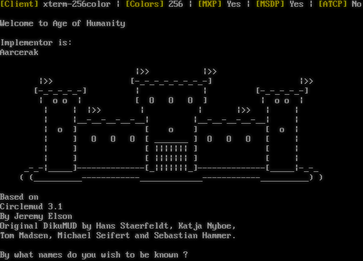 Attempting to Detect Client, Please Wait... [Client] xterm-256color \| [Colors] 256 \| [MXP] Yes \| [MSDP] Yes \| [ATCP] No Welcome to Age of Humanity Implementor is: Aarcerak \|>> \|>> \|>> [-โ€‹_-_-_-_-_-_-_-] \|>> [-โ€‹_-_-_-_-] \| \| [-โ€‹_-_-_-_-] \| o o \| [ O O O ] \| o o \| \| \| \|>> \| \| \|>> \| \| \| \|_โ€‹_-__-__-__-__\| \|_โ€‹_-__-__-__-__\| \| \| o ] [ o ] [ o \| \| ] O O O [ _โ€‹______ ] O O O [ \| \| ] [ \|\|\|\|\|\|\| ] [ \| \| ] [ \|\|\|\|\|\|\| ] [ \| _โ€‹-_-\|_โ€‹____]-โ€‹-------------[_\|\|\|\|\|\|\|_]-โ€‹-------------[_โ€‹____\|-โ€‹_-_ ( (_โ€‹_________------------_____________------------__________) ) Based on Circlemud 3.1 By Jeremy Elson Original DikuMUD by Hans Staerfeldt, Katja Nyboe, Tom Madsen, Michael Seifert and Sebastian Hammer. By what names do you wish to be known ?