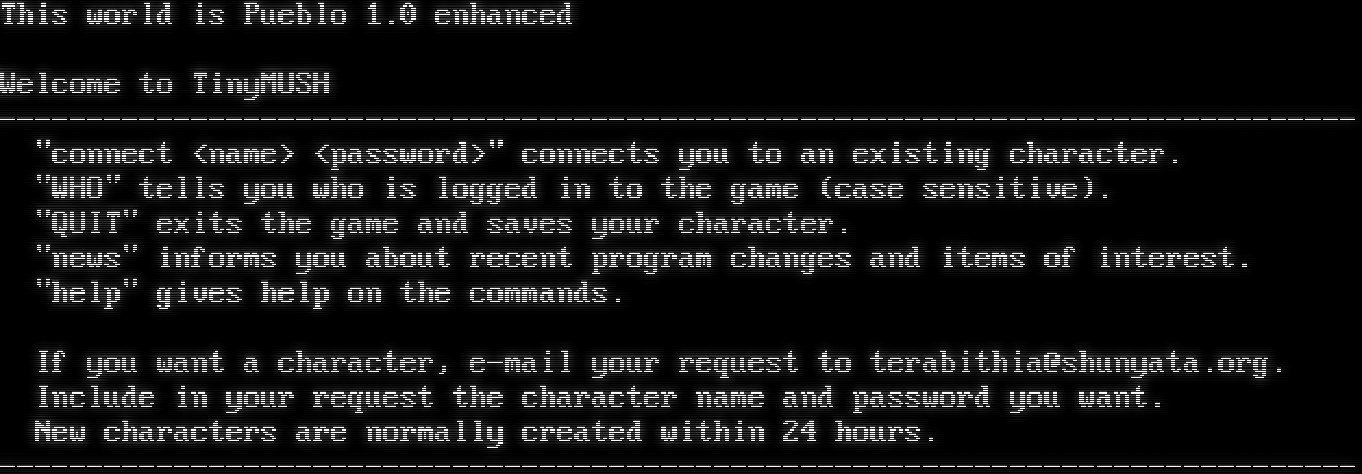 This world is Pueblo 1.0 enhanced Welcome to TinyMUSH -โ€‹----------------------------------------------------------------------------- "connect <name> <password>" connects you to an existing character. "WHO" tells you who is logged in to the game (case sensitive). "QUIT" exits the game and saves your character. "news" informs you about recent program changes and items of interest. "help" gives help on the commands. If you want a character, e-mail your request to terabithia@shunyata.org. Include in your request the character name and password you want. New characters are normally created within 24 hours. -โ€‹-----------------------------------------------------------------------------