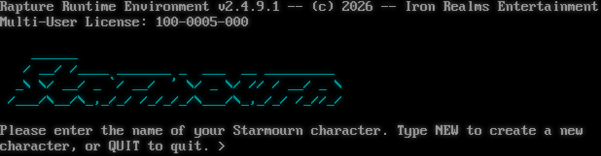 Rapture Runtime Environment v2.4.9.1 -- (c) 2026 -- Iron Realms Entertainment Multi-User License: 100-0005-000 _โ€‹_____ / __/ /_โ€‹___ _โ€‹______ _ ___ __ _โ€‹________ _\\ \\/ __/ _ \`/ __/ ' \\/ _ \\/ // / __/ _ \\ /___/\\__/\\_,_/_/ /_/_/_/\\___/\\_,_/_/ /_//_/ Please enter the name of your Starmourn character. Type NEW to create a new character, or QUIT to quit. >