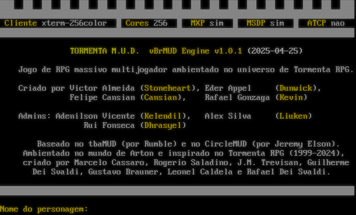 Conectando ao mundo de Tormenta, aguarde.. Cliente xterm-256color Cores 256 MXP sim MSDP sim ATCP nao TORMENTA M.U.D. vBrMUD Engine v1.0.1 (2025-04-25) Jogo de RPG massivo multijogador ambientado no universo de Tormenta RPG. Criado por Victor Almeida (Stoneheart), Eder Appel (Dunwick), Felipe Cansian (Cansian), Rafael Gonzaga (Kevin) Admins: Adenilson Vicente (Kelendil), Alex Silva (Liuken) Rui Fonseca (Dhrasyel) Baseado no tbaMUD (por Rumble) e no CircleMUD (por Jeremy Elson). Ambientado no mundo de Arton e inspirado no Tormenta RPG (1999-2024), criado por Marcelo Cassaro, Rogerio Saladino, J.M. Trevisan, Guilherme Dei Svaldi, Gustavo Brauner, Leonel Caldela e Rafael Dei Svaldi. Nome do personagem: