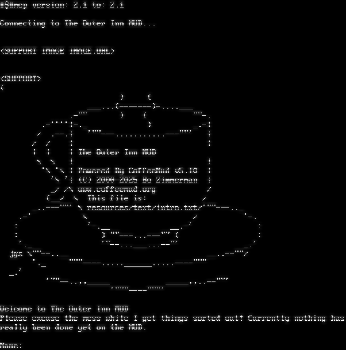 #$#mcp version: 2.1 to: 2.1 Connecting to The Outer Inn MUD... <SUPPORT IMAGE IMAGE.URL> <SUPPORT> ( ) ( _โ€‹__...(-โ€‹------)-โ€‹....___ .-&quot;&quot; ) ( &quot;&quot;-. .-''''\|-._ ) _.-\| / .โ€‹--.\| '&quot;&quot;-โ€‹--...........---&quot;&quot;' \| / / \| \| \| \| \| The Outer Inn MUD \\ \\ \| \| '\\ '\\ \| Powered By CoffeeMud v5.10 \| '\\ '\| (C) 2000-2025 Bo Zimmerman \| _/ /\\ www.coffeemud.org / (__/ \\ This file is: / _โ€‹..---&quot;&quot;' \\ resources/text/intro.txt/'&quot;&quot;-โ€‹--.._ .-' \\ / '-. : '-โ€‹.__ _โ€‹_.-' : : ) &quot;&quot;-โ€‹--...---&quot;&quot; ( : '._ '&quot;-โ€‹-...___...--&quot;' _.' jgs \\&quot;&quot;-โ€‹-..__ _โ€‹_..--&quot;&quot;/ '._ &quot;&quot;&quot;-โ€‹---.....______.....----&quot;&quot;&quot; _.' '&quot;&quot;-โ€‹-..,,_โ€‹____ _โ€‹____,,.โ€‹.--&quot;&quot;' '&quot;&quot;&quot;-โ€‹---&quot;&quot;&quot;' Welcome to The Outer Inn MUD Please excuse the mess while I get things sorted out! Currently nothing has really been done yet on the MUD. Name: