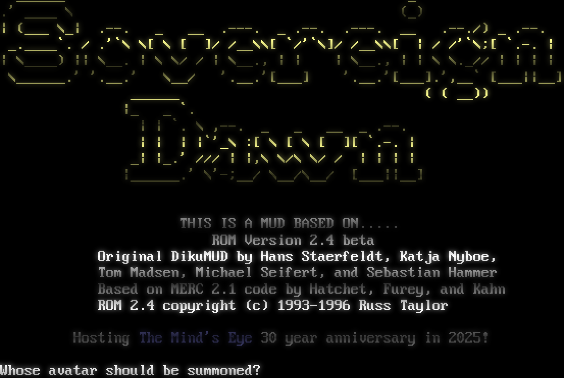 _โ€‹_____ _ .' _โ€‹___ \\ (_) \| (___ \\_\| .โ€‹--. _ __ .โ€‹---. _ .โ€‹--. .โ€‹---. __ .โ€‹--./) _ .โ€‹--. _โ€‹.____\`. / .'\`\\ \\[ \\ [ ]/ /__\\\\[ \`/'\`\\]/ /__\\\\[ \| / /'\`\\;[ \`.-. \| \| \\_โ€‹___) \|\| \\__. \| \\ \\/ / \| \\__., \| \| \| \\__., \| \| \\ \\._// \| \| \| \| \\_โ€‹_____.' '.โ€‹__.' \\__/ '.โ€‹__.'[___] '.โ€‹__.'[___].',__\` [___\|\|__] _โ€‹_____ ( ( __)) \|_ _ \`. \| \| \`. \\ ,--. _ _ __ _ .โ€‹--. \| \| \| \|\`'_\\ :[ \\ [ \\ [ ][ \`.-. \| _\| \|_.' /// \| \|,\\ \\/\\ \\/ / \| \| \| \| \|_โ€‹_____.' \\'-;__/ \\__/\\__/ [___\|\|__] THIS IS A MUD BASED ON.โ€‹.... ROM Version 2.4 beta Original DikuMUD by Hans Staerfeldt, Katja Nyboe, Tom Madsen, Michael Seifert, and Sebastian Hammer Based on MERC 2.1 code by Hatchet, Furey, and Kahn ROM 2.4 copyright (c) 1993-1996 Russ Taylor Hosting The Mind's Eye 30 year anniversary in 2025! Whose avatar should be summoned?