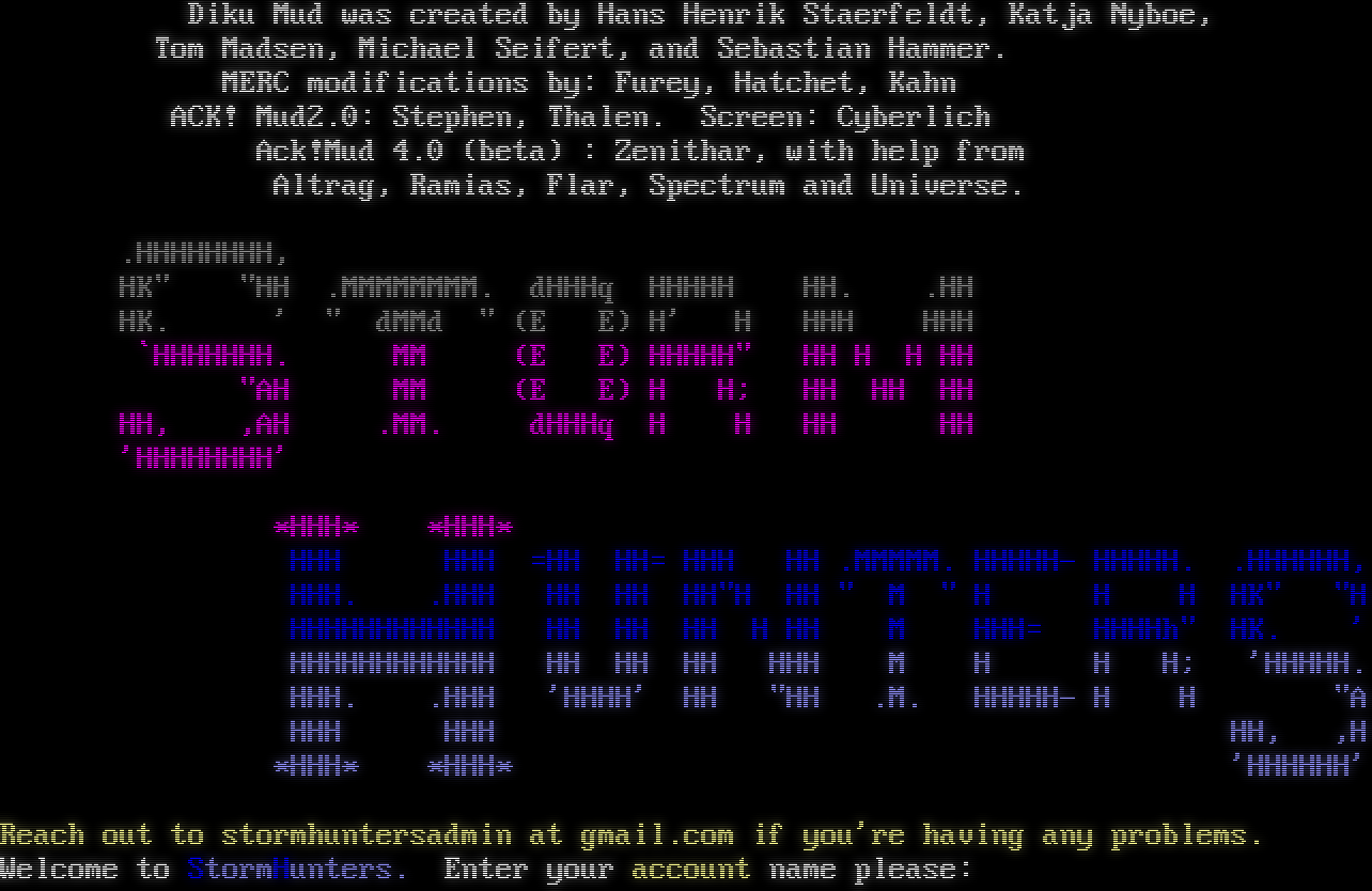 Diku Mud was created by Hans Henrik Staerfeldt, Katja Nyboe, Tom Madsen, Michael Seifert, and Sebastian Hammer. MERC modifications by: Furey, Hatchet, Kahn ACK! Mud2.0: Stephen, Thalen. Screen: Cyberlich Ack!Mud 4.0 (beta) : Zenithar, with help from Altrag, Ramias, Flar, Spectrum and Universe. .HHHHHHHH, HK" "HH .MMMMMMMM. dHHHq HHHHH HH. .HH HK. ' " dMMd " (E E) H' H HHH HHH \`HHHHHHH. MM (E E) HHHHH" HH H H HH "AH MM (E E) H H; HH HH HH HH, ,AH .MM. dHHHq H H HH HH 'HHHHHHHH' \*HHH\* \*HHH\* HHH HHH =HH HH= HHH HH .MMMMM. HHHHH- HHHHH. .HHHHHH, HHH. .HHH HH HH HH"H HH " M " H H H HK" "H HHHHHHHHHHHH HH HH HH H HH M HHH= HHHHh" HK. ' HHHHHHHHHHHH HH HH HH HHH M H H H; 'HHHHH. HHH. .HHH 'HHHH' HH "HH .M. HHHHH- H H "A HHH HHH HH, ,H \*HHH\* \*HHH\* 'HHHHHH' Reach out to stormhuntersadmin at gmail.com if you're having any problems. Welcome to StormHunters. Enter your account name please:
