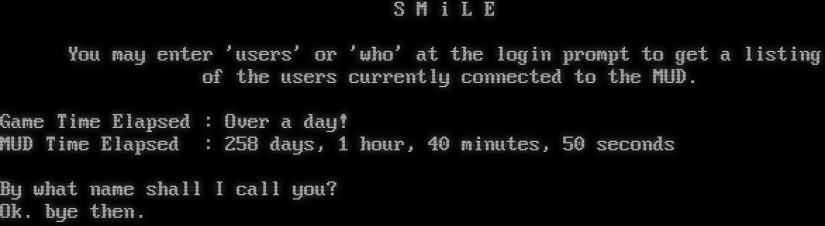 S M i L E You may enter 'users' or 'who' at the login prompt to get a listing of the users currently connected to the MUD. Game Time Elapsed : Over a day! MUD Time Elapsed : 258 days, 1 hour, 40 minutes, 50 seconds By what name shall I call you? Ok. bye then.