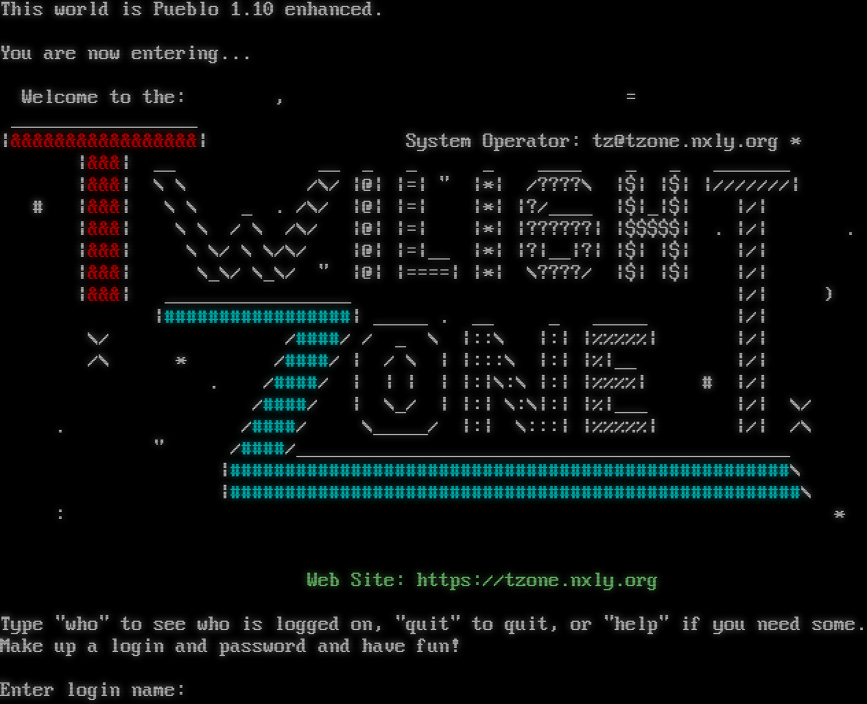 This world is Pueblo 1.10 enhanced. You are now entering... The Twilight Zone Welcome to the: , = _โ€‹________________ \|&&&&&&&&&&&&&&&&&\| System Operator: tz@tzone.nxly.org \* \|&&&\| __ __ _ _ _ _โ€‹___ _ _ _โ€‹______ \|&&&\| \\ \\ /\\/ \|@\| \|=\| " \|\*\| /????\\ \|$\| \|$\| \|///////\| # \|&&&\| \\ \\ _ . /\\/ \|@\| \|=\| \|\*\| \|?/_โ€‹___ \|$\|_\|$\| \|/\| \|&&&\| \\ \\ / \\ /\\/ \|@\| \|=\| \|\*\| \|??????\| \|$$$$$\| . \|/\| . \|&&&\| \\ \\/ \\ \\/\\/ \|@\| \|=\|__ \|\*\| \|?\|__\|?\| \|$\| \|$\| \|/\| \|&&&\| \\_\\/ \\_\\/ " \|@\| \|=โ€‹===\| \|\*\| \\????/ \|$\| \|$\| \|/\| \|&&&\| _โ€‹________________ \|/\| ) \|#โ€‹################\| _โ€‹____ . __ _ _โ€‹____ \|/\| \\/ /#โ€‹###/ / _ \\ \|::\\ \|:\| \|%%%%%\| \|/\| /\\ \* /#โ€‹###/ \| / \\ \| \|:::\\ \|:\| \|%\|__ \|/\| . /#โ€‹###/ \| \| \| \| \|:\|\\:\\ \|:\| \|%%%%\| # \|/\| /#โ€‹###/ \| \\_/ \| \|:\| \\:\\\|:\| \|%\|___ \|/\| \\/ . /#โ€‹###/ \\_โ€‹____/ \|:\| \\:::\| \|%%%%%\| \|/\| /\\ " /#โ€‹###/_โ€‹____________________________________________ \|#โ€‹##################################################\\ \|#โ€‹###################################################\\ : \* T H E F I N A L Z O N E R A T I O N Web Site: https://tzone.nxly.org Type "who" to see who is logged on, "quit" to quit, or "help" if you need some. Make up a login and password and have fun! Enter login name: