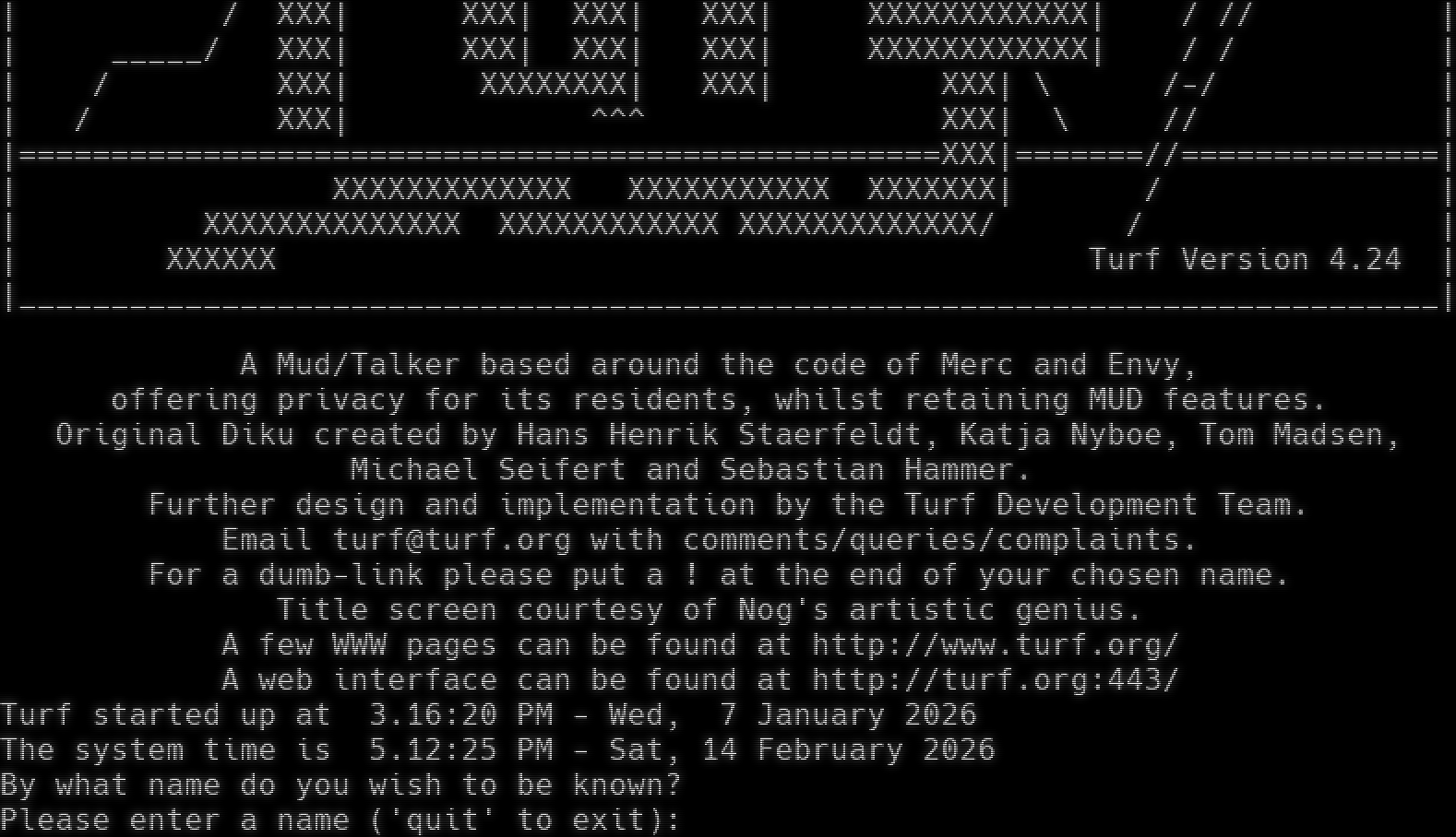 <!-_โ€‹______________________________________________________________________________ \| . __,.โ€‹.--.--..,.โ€‹--._,.โ€‹.__ \| \| . . . __/^ ^ / \\ ^\\__ \| \| .. . .. /^ / / \| \\ \\ '\\_ \| \| .. ...:::.. .. / / \| \| \| \| \| ^\\ \| \| ...:::::::::::.. \| \| \| \\ / \\ \|\| \| .:::::::::::::. ___ \\.โ€‹_.___.._....______..._..__...__../\| \| .:::::::::::::::. / \\__ / / / / \| \| . .. :.:_โ€‹__________ :... .. . / \\__ / // / \| \| XXXXXXXXXXX\| ___/ \\ / // / \| \| XXXXXXXXXXX\| _โ€‹_____/ \\ _โ€‹_____ / / / \| \| : XXX\|:::. ___ ___ ___ _โ€‹___ \\ XXXXXXX\\ / / / \| \| . XXX\| :.XXX\| XXX\| XXXxXXXX\\ \\ XXXXXXXXX\| / / / \| \| . XXX\| XXX\| XXX\| XXXXXXXXX\| \\XXX/ XXX\|/ / /_โ€‹___ \| \| /XXX\| XXX\| XXX\| XXX\| XXX\| XXX\| /__ _- // \| \| / XXX\| XXX\| XXX\| XXX\| _โ€‹___XXX\|_โ€‹___ - / / \| \| / XXX\| XXX\| XXX\| XXX\| XXXXXXXXXXXX\| / // \| \| _โ€‹____/ XXX\| XXX\| XXX\| XXX\| XXXXXXXXXXXX\| / / \| \| / XXX\| XXXXXXXX\| XXX\| XXX\| \\ /-/ \| \| / XXX\| ^^^ XXX\| \\ // \| \|=โ€‹=================================================XXX\|=โ€‹======//=โ€‹=============\| \| XXXXXXXXXXXXX XXXXXXXXXXX XXXXXXX\| / \| \| XXXXXXXXXXXXXX XXXXXXXXXXXX XXXXXXXXXXXXX/ / \| \| XXXXXX Turf Version 4.24 \| \|_โ€‹____________________________________________________________________________\| A Mud/Talker based around the code of Merc and Envy, offering privacy for its residents, whilst retaining MUD features. Original Diku created by Hans Henrik Staerfeldt, Katja Nyboe, Tom Madsen, Michael Seifert and Sebastian Hammer. Further design and implementation by the Turf Development Team. Email turf@turf.org with comments/queries/complaints. For a dumb-link please put a ! at the end of your chosen name. Title screen courtesy of Nog's artistic genius. A few WWW pages can be found at http://www.turf.org/ A web interface can be found at http://turf.org:443/ Turf started up at 3.16:20 PM - Wed, 7 January 2026 The system time is 5.12:25 PM - Sat, 14 February 2026 By what name do you wish to be known? Please enter a name ('quit' to exit):