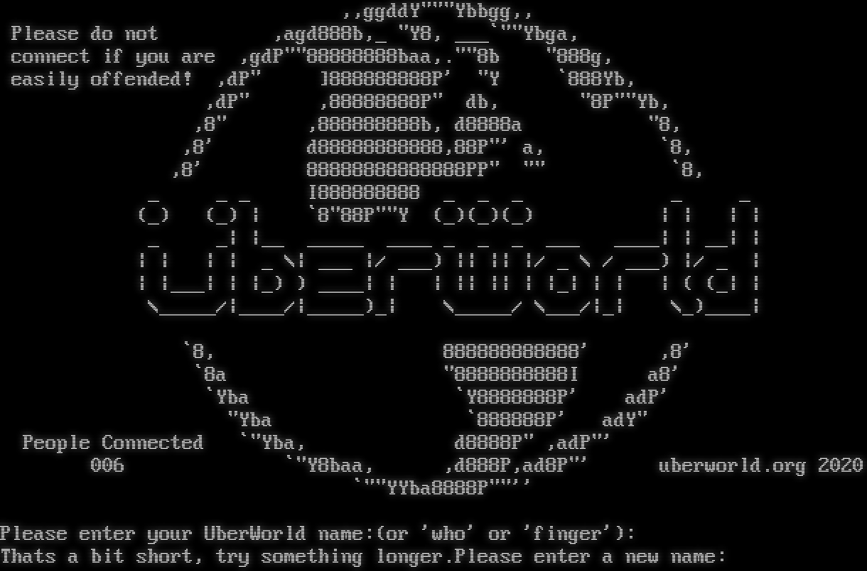,,ggddY"""Ybbgg,, Please do not ,agd888b,_ "Y8, ___\`""Ybga, connect if you are ,gdP""88888888baa,.""8b "888g, easily offended! ,dP" ]888888888P' "Y \`888Yb, ,dP" ,88888888P" db, "8P""Yb, ,8" ,888888888b, d8888a "8, ,8' d88888888888,88P"' a, \`8, ,8' 88888888888888PP" "" \`8, _ _ _ I888888888 _ _ _ _ _ (_) (_) \| \`8"88P""Y (_)(_)(_) \| \| \| \| _ _\| \|__ _โ€‹____ _โ€‹___ _ _ _ ___ _โ€‹___\| \| __\| \| \| \| \| \| _ \\\| ___ \|/ ___) \|\| \|\| \|/ _ \\ / ___) \|/ _ \| \| \|___\| \| \|_) ) _โ€‹___\| \| \| \|\| \|\| \| \|_\| \| \| \| ( (_\| \| \\_โ€‹____/\|_โ€‹___/\|_โ€‹____)_\| \\_โ€‹____/ \\___/\|_\| \\_)_โ€‹___\| \`8, 888888888888' ,8' \`8a "8888888888I a8' \`Yba \`Y8888888P' adP' "Yba \`888888P' adY" People Connected \`"Yba, d8888P" ,adP"' 006 \`"Y8baa, ,d888P,ad8P"' uberworld.org 2020 \`""YYba8888P""'' Please enter your UberWorld name:(or 'who' or 'finger'): Thats a bit short, try something longer.Please enter a new name: