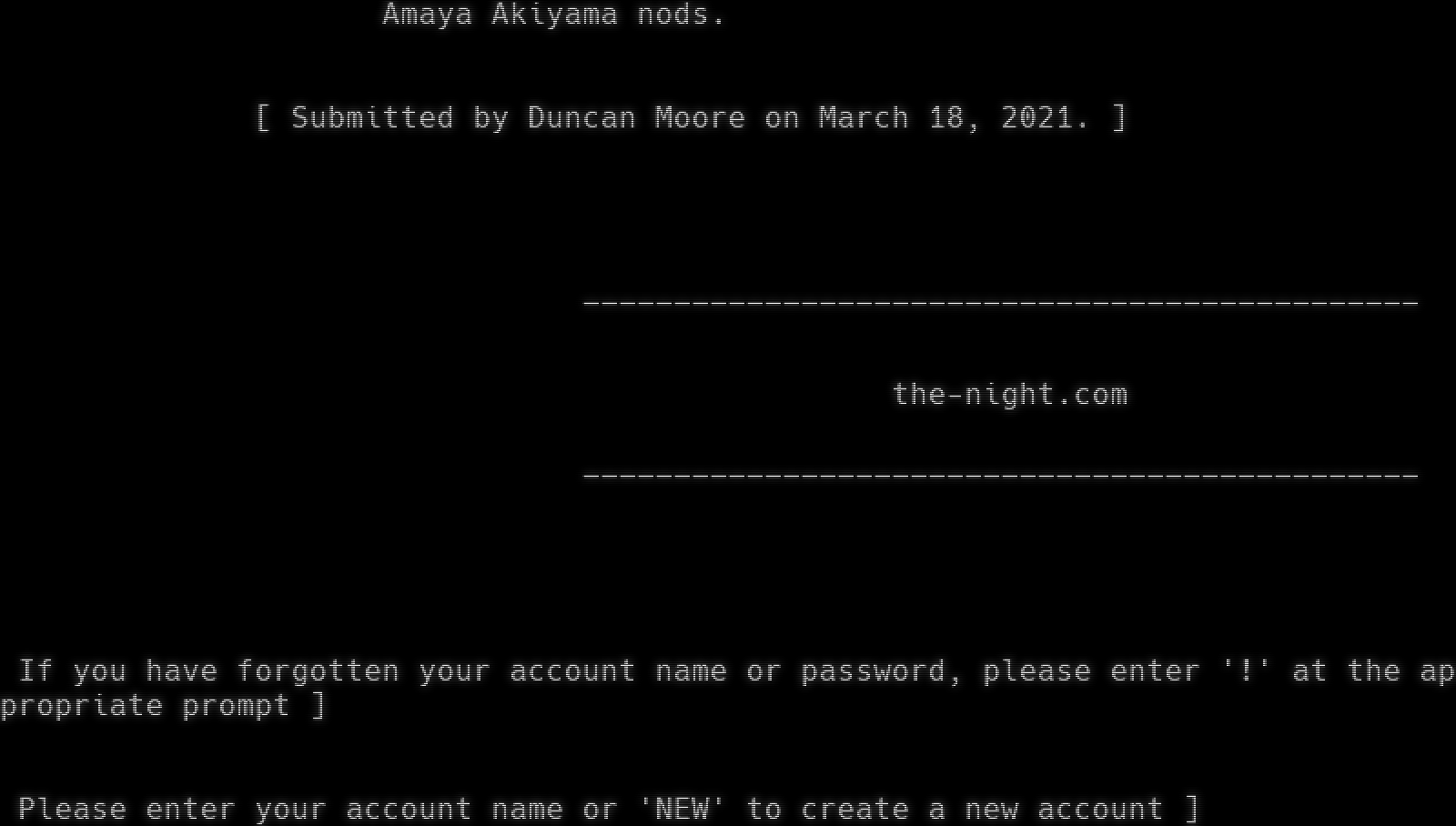 . [ TNC Pots #51 ] Tim Stone pours a swirly stemmed cocktail glass garnished with a sage leaf out on the ground. Amaya Akiyama says with a gentle, melodious tone with a subtle Scottish timbre, "For the homies." Amaya Akiyama nods. [ Submitted by Duncan Moore on March 18, 2021. ] _โ€‹_____________________________________________ the-night.com _โ€‹_____________________________________________ If you have forgotten your account name or password, please enter '!' at the appropriate prompt ] Please enter your account name or 'NEW' to create a new account ]