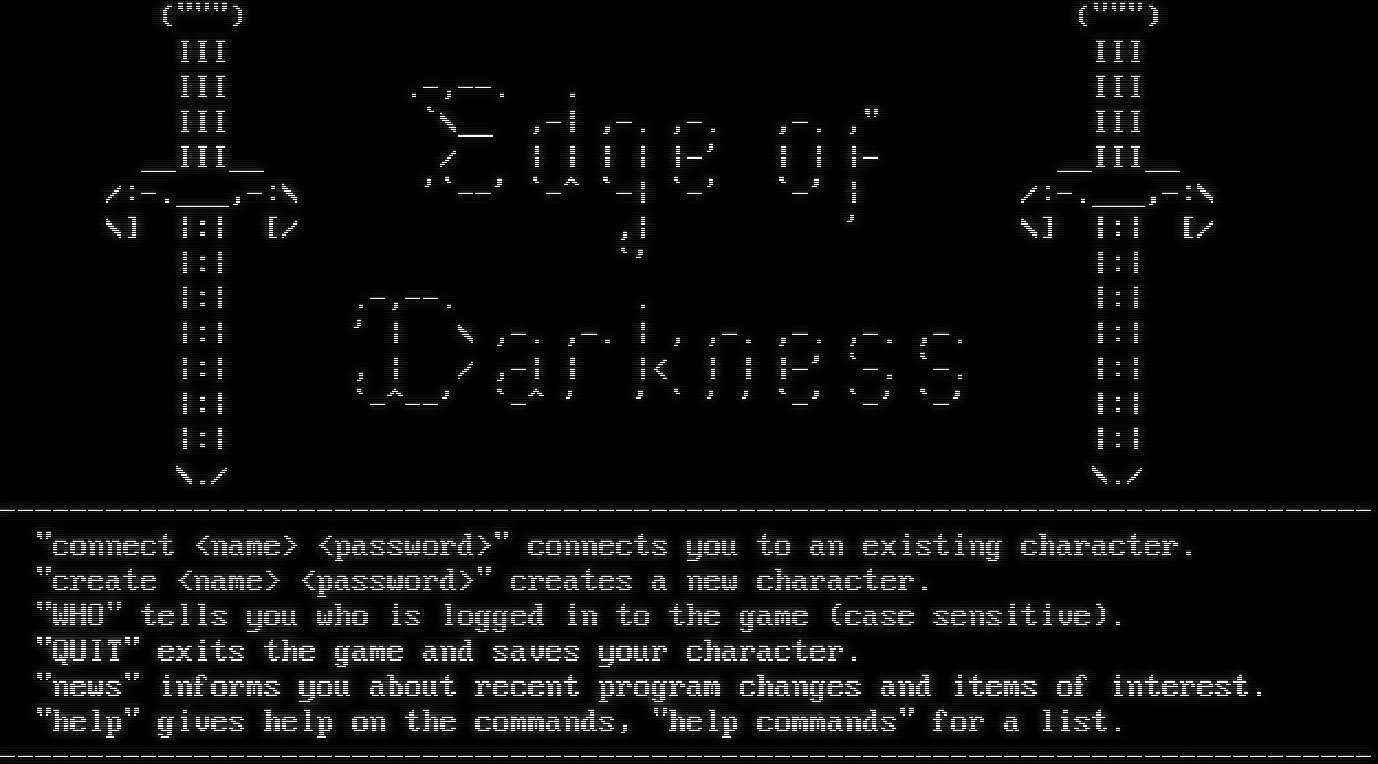 (""") (""") III III III .-,--. . III III \`\\__ ,-\| ,-. ,-. ,-. ," III __III__ / \| \| \| \| \|-' \| \| \|- __III__ /:-โ€‹.___,-:\\ '\`--' \`-^ \`-\| \`-' \`-' \| /:-โ€‹.___,-:\\ \\] \|:\| [/ ,\| ' \\] \|:\| [/ \|:\| \`' \|:\| \|:\| .-,--. . \|:\| \|:\| ' \| \\ ,-. ,-. \| , ,-. ,-. ,-. ,-. \|:\| \|:\| , \| / ,-\| \| \|< \| \| \|-' \`-. \`-. \|:\| \|:\| \`-โ€‹^--' \`-^ ' ' \` ' ' \`-' \`-' \`-' \|:\| \|:\| \|:\| \\./ \\./ -โ€‹----------------------------------------------------------------------------- "connect <name> <password>" connects you to an existing character. "create <name> <password>" creates a new character. "WHO" tells you who is logged in to the game (case sensitive). "QUIT" exits the game and saves your character. "news" informs you about recent program changes and items of interest. "help" gives help on the commands, "help commands" for a list. -โ€‹-----------------------------------------------------------------------------
