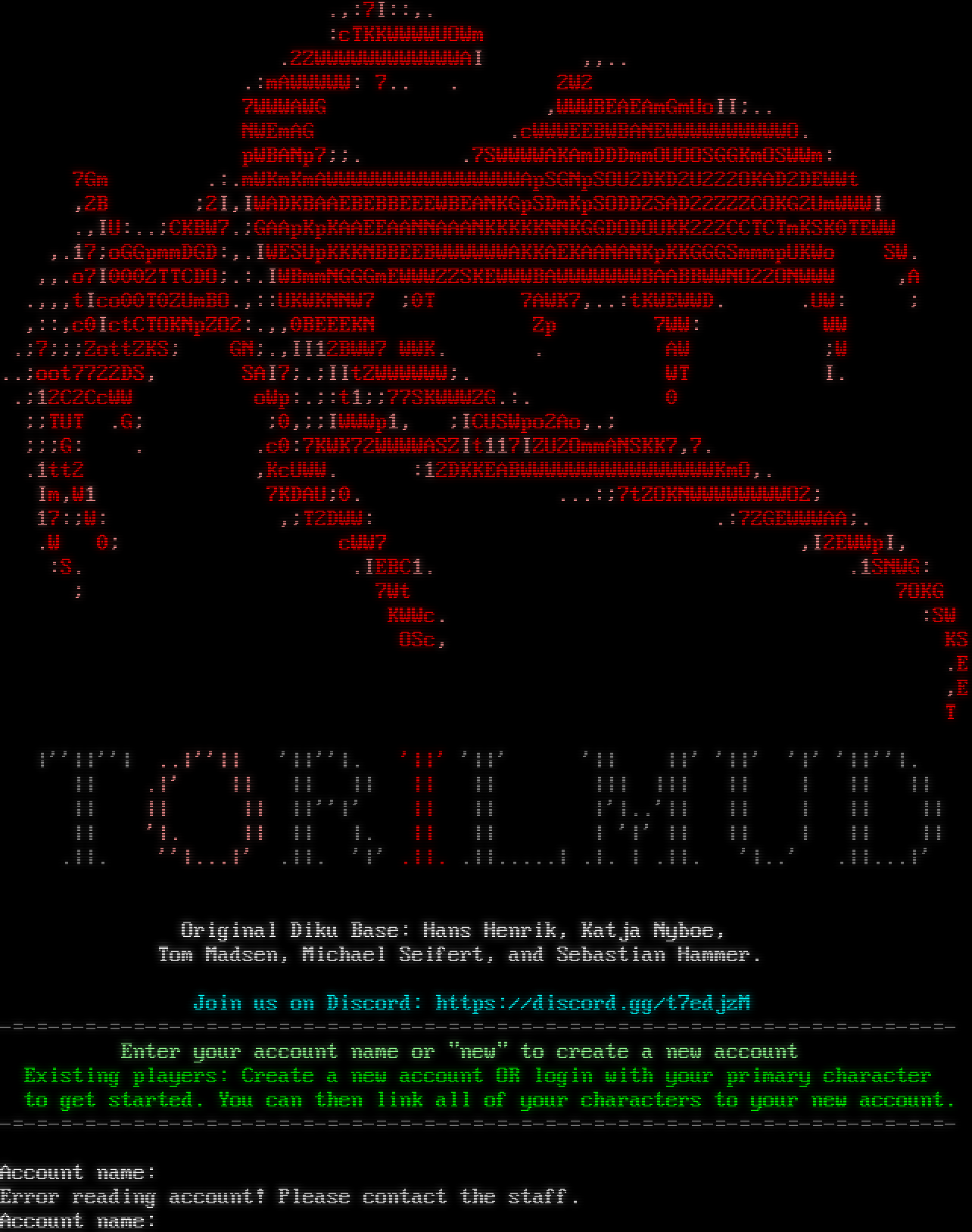 .,:7I::,. :cTKKWWWWUOWm .2ZWWWWWWWWWWWWAI ,,.. .:mAWWWWW: 7.. . 2W2 7WWWAWG ,WWWBEAEAmGmUoII;.. NWEmAG .cWWWEEBWBANEWWWWWWWWWWO. pWBANp7;;. .7SWWWWAKAmDDDmmOUOOSGGKmOSWWm: 7Gm .:.mWKmKmAWWWWWWWWWWWWWWWWApSGNpSOU2DKD2U222OKAD2DEWWt ,2B ;2I,IWADKBAAEBEBBEEEWBEANKGpSDmKpSODDZSAD22ZZZCOKG2UmWWWI .,IU:..;CKBW7.;GAApKpKAAEEAANNAAANKKKKKNNKGGDODOUKK222CCTCTmKSK0TEWW ,.17;oGGpmmDGD:,.IWESUpKKKNBBEEBWWWWWWAKKAEKAANANKpKKGGGSmmmpUKWo SW. ,,.o7I000ZTTCDO;.:.IWBmmNGGGmEWWWZZSKEWWWBAWWWWWWWBAABBWWNO22ONWWW ,A .,,,tIco00T0ZUmBO.,::UKWKNNW7 ;0T 7AWK7,..:tKWEWWD. .UW: ; ,::,c0IctCTOKNpZO2:.,,0BEEEKN Zp 7WW: WW .;7;;;ZottZKS; GN;.,II12BWW7 WWK. . AW ;W ..;oot7722DS, SAI7;.;IItZWWWWWW;. WT I. .;12C2CcWW oWp:.;:t1;;77SKWWWZG.:. 0 ;;TUT .G; ;0,;;IWWWp1, ;ICUSWpo2Ao,.; ;;;G: . .c0:7KWK72WWWWASZIt117IZU2OmmANSKK7,7. .1tt2 ,KcUWW. :12DKKEABWWWWWWWWWWWWWWWWKmO,. Im,W1 7KDAU;0. ...:;7tZOKNWWWWWWWWO2; 17:;W: ,;T2DWW: .:7ZGEWWWAA;. .W 0; cWW7 ,I2EWWpI, :S. .IEBC1. .1SNWG: ; 7Wt 7OKG KWWc. :SW OSc, KS .E ,E T \|''\|\|''\| ..\|''\|\| '\|\|''\|. '\|\|' '\|\|' '\|\| \|\|' '\|\|' '\|' '\|\|''\|. \|\| .\|' \|\| \|\| \|\| \|\| \|\| \|\|\| \|\|\| \|\| \| \|\| \|\| \|\| \|\| \|\| \|\|''\|' \|\| \|\| \|'\|..'\|\| \|\| \| \|\| \|\| \|\| '\|. \|\| \|\| \|. \|\| \|\| \| '\|' \|\| \|\| \| \|\| \|\| .\|\|. ''\|...\|' .\|\|. '\|' .\|\|. .\|\|.โ€‹....\| .\|. \| .\|\|. '\|..' .\|\|...\|' Original Diku Base: Hans Henrik, Katja Nyboe, Tom Madsen, Michael Seifert, and Sebastian Hammer. Join us on Discord: https://discord.gg/t7edjzM -โ€‹=-=-=-=-=-=-=-=-=-=-=-=-=-=-=-=-=-=-=-=-=-=-=-=-=-=-=-=-=-=-=-=-=-=-=-=-=-=-=- Enter your account name or "new" to create a new account Existing players: Create a new account OR login with your primary character to get started. You can then link all of your characters to your new account. -โ€‹=-=-=-=-=-=-=-=-=-=-=-=-=-=-=-=-=-=-=-=-=-=-=-=-=-=-=-=-=-=-=-=-=-=-=-=-=-=-=- Account name: Error reading account! Please contact the staff. Account name: