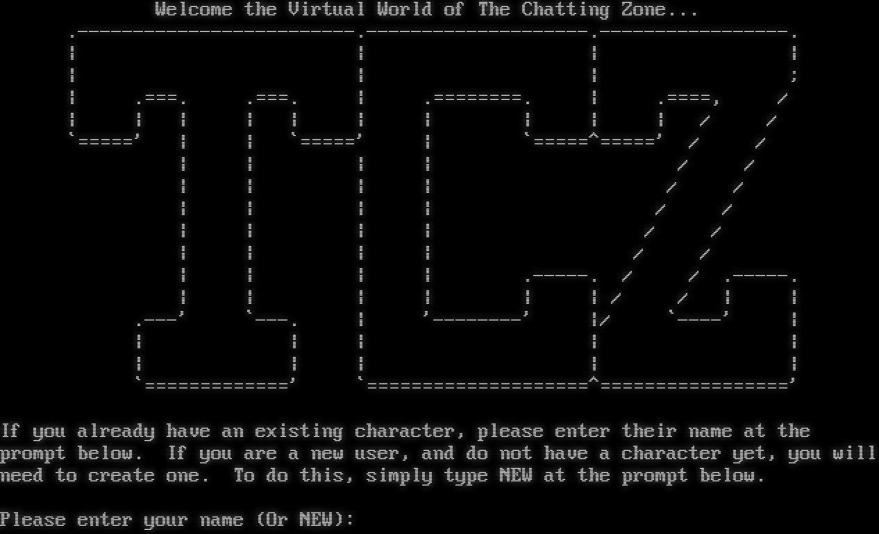 Welcome the Virtual World of The Chatting Zone... .โ€‹-------------------------.--------------------.-----------------. \| \| \| \| \| \| \| ; \| .โ€‹===. .โ€‹===. \| .โ€‹========. \| .โ€‹====, / \| \| \| \| \| \| \| \| \| \| / / \`=โ€‹====' \| \| \`=โ€‹====' \| \`=โ€‹====^=====' / / \| \| \| \| / / \| \| \| \| / / \| \| \| \| / / \| \| \| \| / / \| \| \| \| / / \| \| \| \| .โ€‹-----. / / .โ€‹-----. \| \| \| \| \| \| / / \| \| .โ€‹---' \`-โ€‹--. \| '-โ€‹-------' \|/ \`-โ€‹---' \| \| \| \| \| \| \| \| \| \| \| \`=โ€‹============' \`=โ€‹===================^=================' If you already have an existing character, please enter their name at the prompt below. If you are a new user, and do not have a character yet, you will need to create one. To do this, simply type NEW at the prompt below. Please enter your name (Or NEW):
