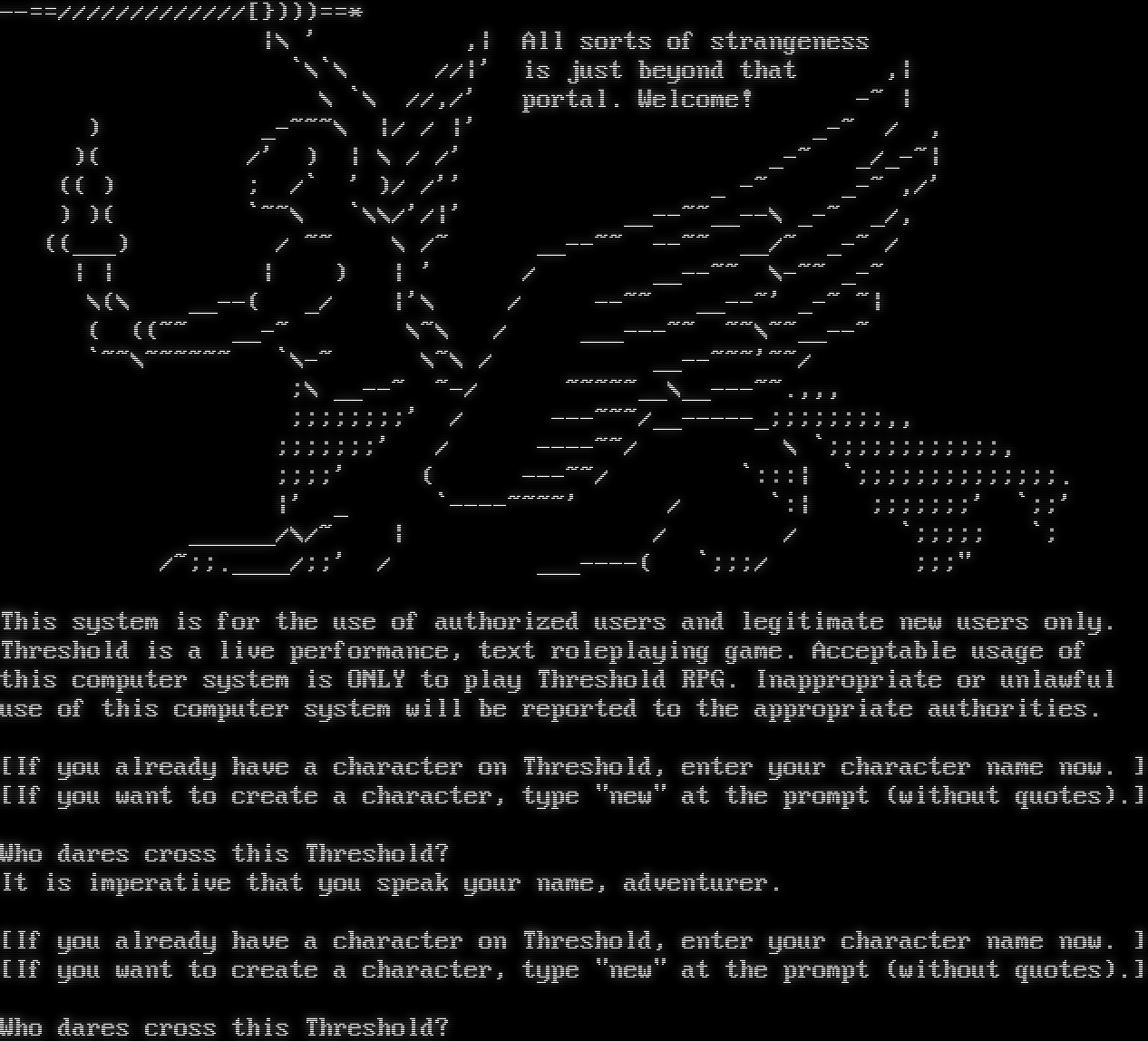 -โ€‹-==/////////////[})))==\* \|\\ ' ,\| All sorts of strangeness \`\\\`\\ //\|' is just beyond that ,\| \\ \`\\ //,/' portal. Welcome! -~ \| ) _โ€‹-~~~\\ \|/ / \|' _-~ / , )( /' ) \| \\ / /' _-~ _/_-~\| (( ) ; /\` ' )/ /'' _ -~ _-~ ,/' ) )( \`~~\\ \`\\\\/'/\|' _โ€‹_--~~__--\\ _-~ _/, ((___) / ~~ \\ /~ _โ€‹_--~~ -โ€‹-~~ __/~ _-~ / \| \| \| ) \| ' / _โ€‹_--~~ \\-~~ _-~ \\(\\ _โ€‹_--( _/ \|'\\ / -โ€‹-~~ _โ€‹_--~' _-~ ~\| ( ((~~ _โ€‹_-~ \\~\\ / _โ€‹__---~~ ~~\\~โ€‹~__--~ \`~~\\~โ€‹~~~~~ \`\\-~ \\~\\ / _โ€‹_--~~~'~~/ ;\\ _โ€‹_--~ ~-/ ~โ€‹~~~~__\\_โ€‹_---~~.,,, ;;;;;;;;' / -โ€‹--~~~/_โ€‹_-----_;;;;;;;;,, ;;;;;;;' / -โ€‹---~~/ \\ \`;;;;;;;;;;;;, ;;;;' ( -โ€‹--~~/ \`:::\| \`;;;;;;;;;;;;;;. \|' _ \`-โ€‹---~~~~' / \`:\| ;;;;;;;' \`;;' _โ€‹_____/\\/~ \| / / \`;;;;; \`; /~;;.โ€‹____/;;' / _โ€‹__----( \`;;;/ ;;;" This system is for the use of authorized users and legitimate new users only. Threshold is a live performance, text roleplaying game. Acceptable usage of this computer system is ONLY to play Threshold RPG. Inappropriate or unlawful use of this computer system will be reported to the appropriate authorities. [If you already have a character on Threshold, enter your character name now. ] [If you want to create a character, type "new" at the prompt (without quotes).] Who dares cross this Threshold? It is imperative that you speak your name, adventurer. [If you already have a character on Threshold, enter your character name now. ] [If you want to create a character, type "new" at the prompt (without quotes).] Who dares cross this Threshold?