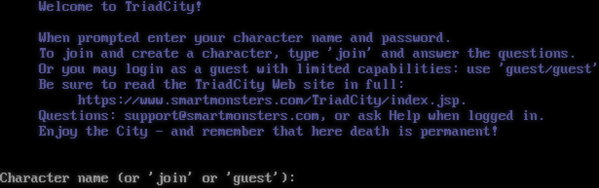 Welcome to TriadCity! When prompted enter your character name and password. To join and create a character, type 'join' and answer the questions. Or you may login as a guest with limited capabilities: use 'guest/guest' Be sure to read the TriadCity Web site in full: https://www.smartmonsters.com/TriadCity/index.jsp. Questions: support@smartmonsters.com, or ask Help when logged in. Enjoy the City - and remember that here death is permanent! Character name (or 'join' or 'guest'):