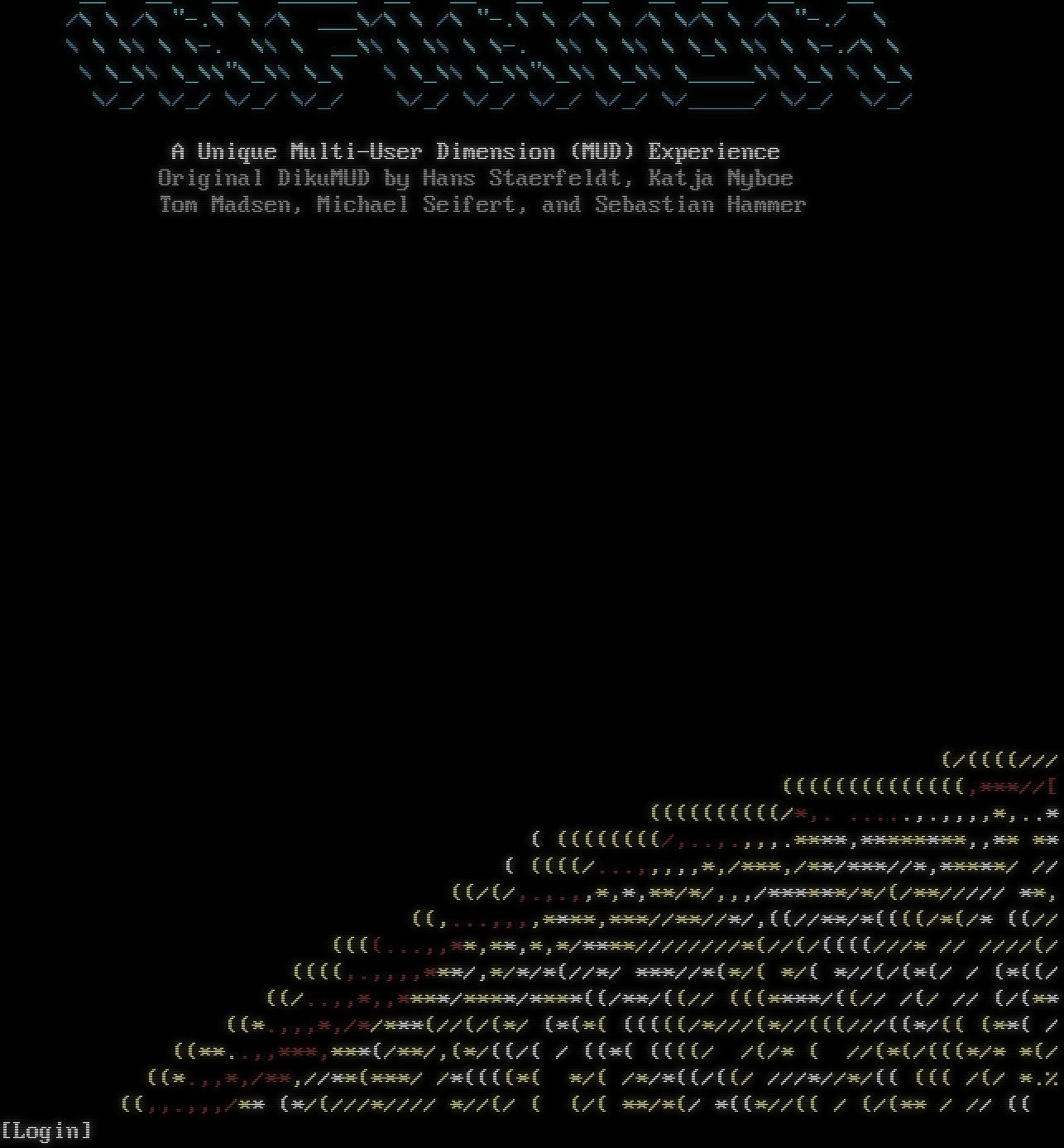 __ __ __ _โ€‹_____ __ __ __ __ __ __ __ __ /\\ \\ /\\ "-.\\ \\ /\\ ___\\/\\ \\ /\\ "-.\\ \\ /\\ \\ /\\ \\/\\ \\ /\\ "-./ \\ \\ \\ \\\\ \\ \\-. \\\\ \\ __\\\\ \\ \\\\ \\ \\-. \\\\ \\ \\\\ \\ \\_\\ \\\\ \\ \\-./\\ \\ \\ \\_\\\\ \\_\\\\"\\_\\\\ \\_\\ \\ \\_\\\\ \\_\\\\"\\_\\\\ \\_\\\\ \\_โ€‹____\\\\ \\_\\ \\ \\_\\ \\/_/ \\/_/ \\/_/ \\/_/ \\/_/ \\/_/ \\/_/ \\/_/ \\/_โ€‹____/ \\/_/ \\/_/ A Unique Multi-User Dimension (MUD) Experience Original DikuMUD by Hans Staerfeldt, Katja Nyboe Tom Madsen, Michael Seifert, and Sebastian Hammer (/((((/// ((((((((((((((,\*\*\*//[ ((((((((((/\*,. .โ€‹....,.,,,,\*,..\* ( ((((((((/,..,.,,,.\*\*\*\*,\*\*\*\*\*\*\*\*,,\*\* \*\* ( ((((/...,,,,,\*,/\*\*\*,/\*\*/\*\*\*//\*,\*\*\*\*\*/ // ((/(/,.,.,,\*,\*,\*\*/\*/,,,/\*\*\*\*\*\*/\*/(/\*\*///// \*\*, ((,...,,,,\*\*\*\*,\*\*\*//\*\*//\*/,((//\*\*/\*((((/\*(/\* ((// ((((...,,\*\*,\*\*,\*,\*/\*\*\*\*////////\*(//(/((((///\* // ////(/ ((((,.,,,,\*\*\*/,\*/\*/\*(//\*/ \*\*\*//\*(\*/( \*/( \*//(/(\*(/ / (\*((/ ((/..,,\*,,\*\*\*\*/\*\*\*\*/\*\*\*\*((/\*\*/((// (((\*\*\*\*/((// /(/ // (/(\*\* ((\*.,,,\*,/\*/\*\*\*(//(/(\*/ (\*(\*( (((((/\*///(\*//(((///((\*/(( (\*\*( / ((\*\*..,,\*\*\*,\*\*\*(/\*\*/,(\*/((/( / ((\*( ((((/ /(/\* ( //(\*(/(((\*/\* \*(/ ((\*.,,\*,/\*\*,//\*\*(\*\*\*/ /\*((((\*( \*/( /\*/\*((/((/ ///\*//\*/(( ((( /(/ \*.% ((,,.,,,/\*\* (\*/(///\*//// \*//(/ ( (/( \*\*/\*(/ \*((\*//(( / (/(\*\* / // (( [Login]