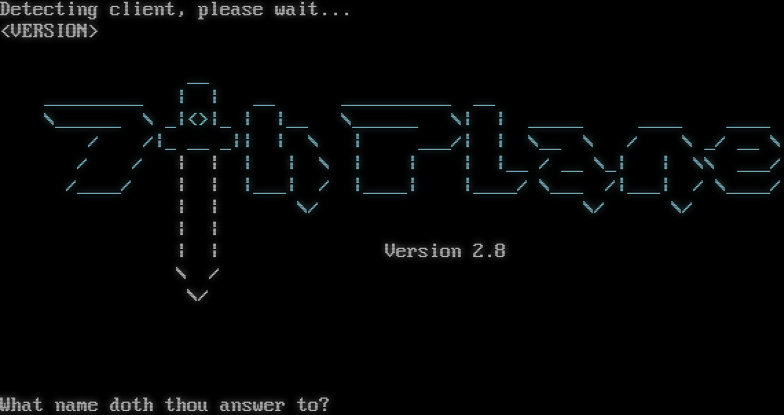 Detecting client, please wait... <VERSION> __ _โ€‹________ \| \| __ _โ€‹_________ __ \\_โ€‹_____ \\ _\|<>\|_ \| \|__ \\_โ€‹_____ \\\| \| _โ€‹____ _โ€‹___ _โ€‹___ / /\|_ __ _\|\| \| \\ \| ___/\| \| \\__ \\ / \\ _/ __ \\ / / \| \| \| \| \\ \| \| \| \|__ / __ \\_\| \| \\\\ ___/ /_โ€‹___/ \| \| \|___\| / \|_โ€‹___\| \|_โ€‹___/ \\___ /\|___\| / \\_โ€‹___/ \| \| \\/ \\/ \\/ \| \| \| \| Version 2.8 \\ / \\/ What name doth thou answer to?