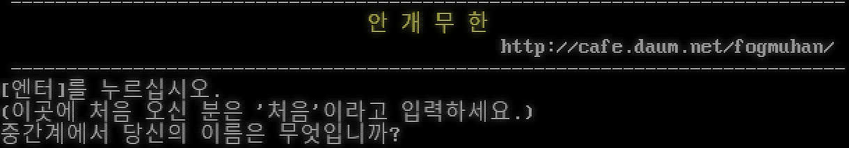 -โ€‹-------------------------------------------------------------------------- ์•ˆ ๊ฐœ ๋ฌด ํ•œ http://cafe.daum.net/fogmuhan/ -โ€‹-------------------------------------------------------------------------- [์—”ํ„ฐ]๋ฅผ ๋ˆ„๋ฅด์‹ญ์‹œ์˜ค. (์ด๊ณณ์— ์ฒ˜์Œ ์˜ค์‹  ๋ถ„์€ '์ฒ˜์Œ'์ด๋ผ๊ณ  ์ž…๋ ฅํ•˜์„ธ์š”.) ์ค‘๊ฐ„๊ณ„์—์„œ ๋‹น์‹ ์˜ ์ด๋ฆ„์€ ๋ฌด์—‡์ž…๋‹ˆ๊นŒ?