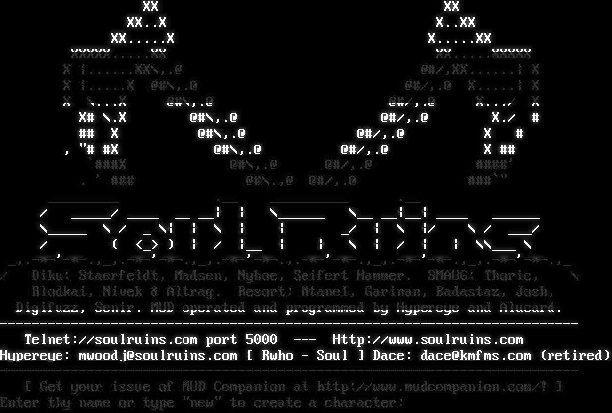 XX XX XX..X X..XX XX.โ€‹....X X.โ€‹....XX XXXXX.โ€‹....XX XX.โ€‹....XXXXX X \|.โ€‹.....XX\\,.@ @#/,XX.โ€‹.....\| X X \|.โ€‹....X @#\\,.@ @#/,.@ X.โ€‹....\| X X \\...X @#\\,.@ @#/,.@ X.../ X X# \\.X @#\\,.@ @#/,.@ X./ # ## X @#\\,.@ @#/,.@ X # , "# #X @#\\,.@ @#/,.@ X ## \`###X @#\\,.@ @#/,.@ #โ€‹###' . ' ### @#\\.,@ @#/,.@ ###\`" _โ€‹________ .__ _โ€‹_________ .__ / _โ€‹____/ _โ€‹___ __ __\| \| \\_โ€‹_____ \\__ __\|__\| _โ€‹___ _โ€‹_____ \\_โ€‹____ \\ / _ \\\| \| \\ \| \| _/ \| \\ \|/ \\ / ___/ / ( <_> ) \| / \|__ \| \| \\ \| / \| \| \\\\___ \\ _,.-\*-'-\*-.,_,.-\*-'-\*-.,_,.-\*-'-\*-.,.-\*-'-\*-.,_,.-\*-'-\*-.,_,.-\*-'-\*-.,_ / Diku: Staerfeldt, Madsen, Nyboe, Seifert Hammer. SMAUG: Thoric, \\ Blodkai, Nivek & Altrag. Resort: Ntanel, Garinan, Badastaz, Josh, Digifuzz, Senir. MUD operated and programmed by Hypereye and Alucard. -โ€‹------------------------------------------------------------------------ Telnet://soulruins.com port 5000 --- Http://www.soulruins.com Hypereye: mwoodj@soulruins.com [ Rwho - Soul ] Dace: dace@kmfms.com (retired) -โ€‹------------------------------------------------------------------------ [ Get your issue of MUD Companion at http://www.mudcompanion.com/! ] Enter thy name or type "new" to create a character:
