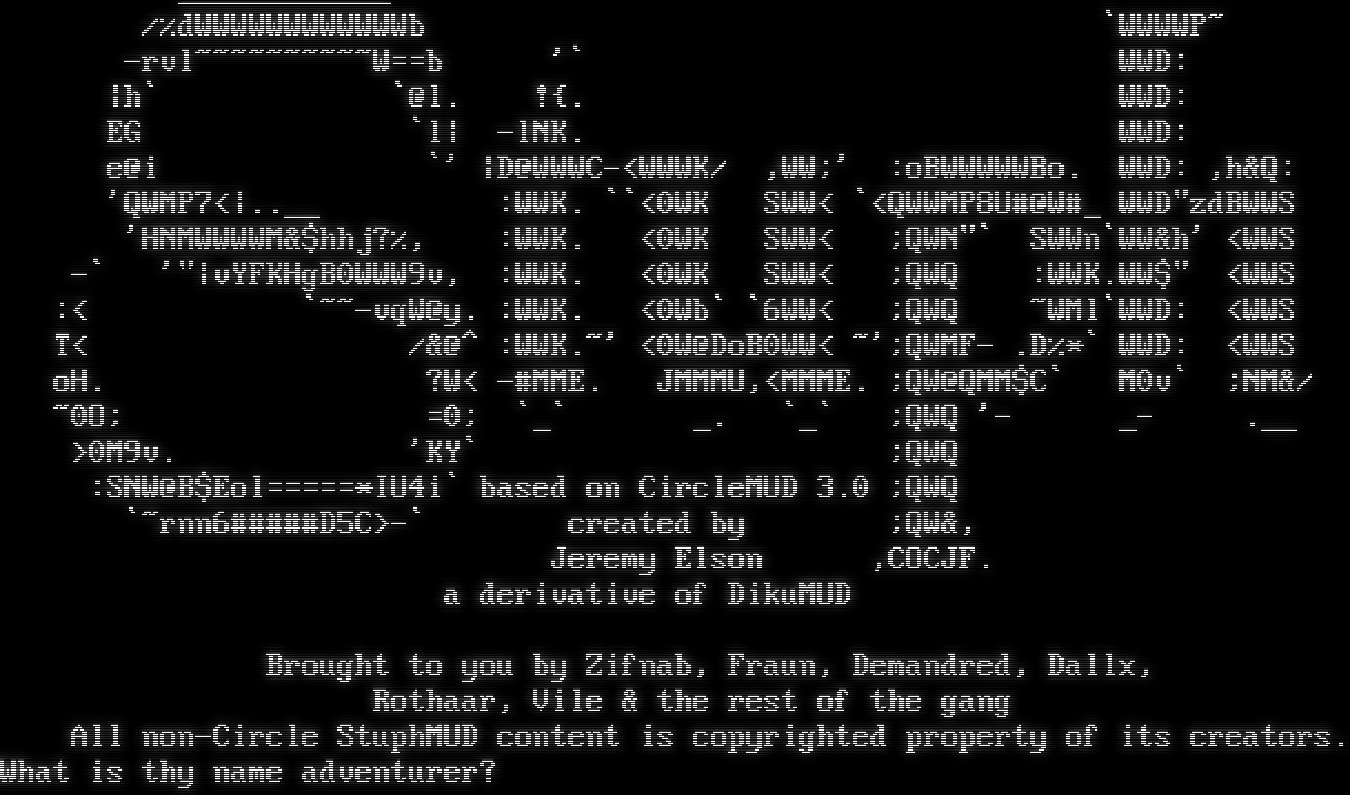_โ€‹___________ /%dWWWWWWWWWWWWb \`WWWWP~ -rvl~โ€‹~~~~~~~~~W==b '\` WWD: \|h\` \`@l. !{. WWD: EG \`l\| -lNK. WWD: e@i \`' \|D@WWWC-<WWWK/ ,WW;' :oBWWWWWBo. WWD: ,h&Q: 'QWMP7<\|.โ€‹.__ :WWK. \`\`<0WK SWW< \`<QWWMP8U#@W#_ WWD"zdBWWS 'HNMWWWWM&$hhj?%, :WWK. <0WK SWW< ;QWN"\` SWWn\`WW&h' <WWS -\` '"\|vYFKHgB0WWW9v, :WWK. <0WK SWW< ;QWQ :WWK.WW$" <WWS :< \`~~-vqW@y. :WWK. <0Wb\` \`6WW< ;QWQ ~WMl\`WWD: <WWS T< /&@^ :WWK.~' <0W@DoB0WW< ~';QWMF- .D%\*\` WWD: <WWS oH. ?W< -#MME. JMMMU,<MMME. ;QW@QMM$C\` M0v\` ;NM&/ ~0O; =0; \`_\` _. \`_\` ;QWQ '- _- .__ >0M9v. 'KY\` ;QWQ :SNW@B$Eol=โ€‹====\*IU4i\` based on CircleMUD 3.0 ;QWQ \`~rnn6#โ€‹####D5C>-\` created by ;QW&, Jeremy Elson ,COCJF. a derivative of DikuMUD Brought to you by Zifnab, Fraun, Demandred, Dallx, Rothaar, Vile & the rest of the gang All non-Circle StuphMUD content is copyrighted property of its creators. What is thy name adventurer?