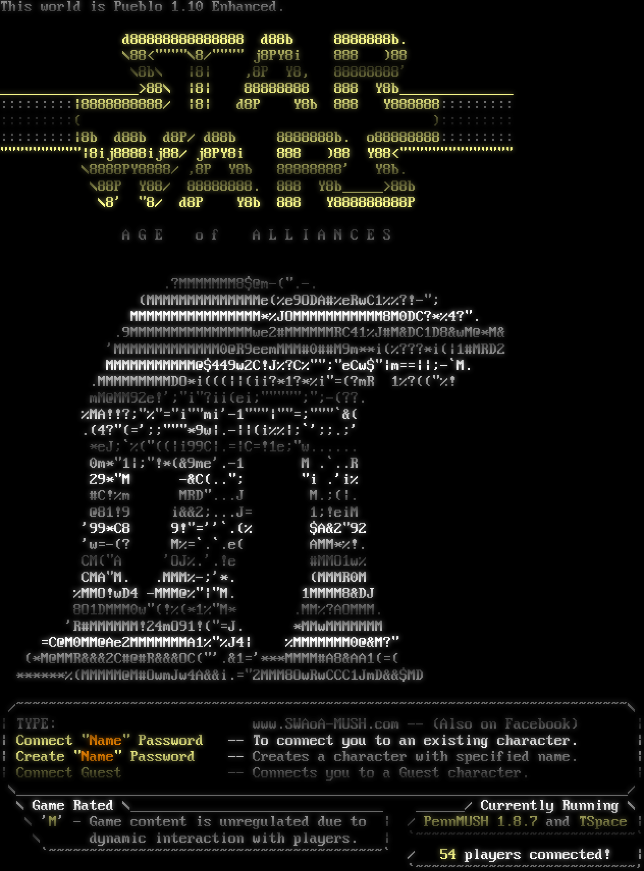 This world is Pueblo 1.10 Enhanced. d88888888888888 d88b 8888888b. \\88<"โ€‹"""\\8/"โ€‹""" j8PY8i 888 )88 \\8b\\ \|8\| ,8P Y8, 88888888' _โ€‹________________>88\\ \|8\| 88888888 888 Y8b_โ€‹_____________ :::::::::\|8888888888/ \|8\| d8P Y8b 888 Y888888::::::::: :::::::::( )::::::::: :::::::::\|8b d88b d8P/ d88b 8888888b. o88888888::::::::: "โ€‹"""""""""\|8ij8888ij88/ j8PY8i 888 )88 Y88<"โ€‹""""""""""""" \\8888PY8888/ ,8P Y8b 88888888' Y8b. \\88P Y88/ 88888888. 888 Y8b_โ€‹____>88b \\8' "8/ d8P Y8b 888 Y888888888P A G E o f A L L I A N C E S .?MMMMMMM8$@m-("โ€‹.-. (MMMMMMMMMMMMMMe(%e9ODA#%eRwC1%%?!-"; MMMMMMMMMMMMMMMM\*%JOMMMMMMMMMMM8M0DC?\*%4?". .9MMMMMMMMMMMMMMMwe2#MMMMMMRC41%J#M&DC1D8&wM@\*M& 'MMMMMMMMMMMMM0@R9eemMMM#0##M9m\*\*i(%???\*i(\|1#MRD2 MMMMMMMMMMM@$449w2C!J%?C%"";"eCw$"\|m==\|\|;-\`M. .MMMMMMMMMDO\*i(((\|\|(ii?\*1?\*%i"=(?mR 1%?(("%! mM@MM92e!';"i"?ii(ei;"โ€‹"""";";-(??. %MA!!?;"%"="i""mi'-1"""\|""=;"""\`&( .(4?"(=';;"""\*9w\|.-\|\|(i%%\|;\`';;.;' \*eJ;\`%("((\|i99C\|.=\|C=!1e;"w.โ€‹..... 0m\*"1\|;"!\*(&9me'.-1 M .\`..R 29\*"M -&C(.."; "i .'i% #C!%m MRD"โ€‹...J M.;(\|. @81!9 i&&2;...J= 1;!eiM '99\*C8 9!"=''\`.(% $A&2"92 'w=-(? M%=\`.\`.e( AMM\*%!. CM("A 'OJ%.'.!e #MMO1w% CMA"M. .MMM%-;'\*. (MMMR0M %MMO!wD4 -MMM@%"\|"M. 1MMMM8&DJ 8O1DMMM0w"(!%(\*1%"M\* .MM%?AOMMM. 'R#MMMMMM!24mO91!("=J. \*MMwMMMMMMM =C@M0MM@Ae2MMMMMMMA1%"%J4\| %MMMMMMM0@&M?" (\*M@MMR&&&2C#@#R&&&OC("'.&1='\*\*\*MMMM#A8&AA1(=( \*\*\*\*\*\*%(MMMMM@M#OwmJw4A&&i.="2MMM8OwRwCCC1JmD&&$MD /~โ€‹~~~~~~~~~~~~~~~~~~~~~~~~~~~~~~~~~~~~~~~~~~~~~~~~~~~~~~~~~~~~~~~~~~~~~~~~~~\\ \| TYPE: www.SWAoA-MUSH.com -- (Also on Facebook) \| \| Connect "Name" Password -- To connect you to an existing character. \| \| Create "Name" Password -- Creates a character with specified name. \| \| Connect Guest -- Connects you to a Guest character. \| \\_โ€‹__________________________________________________________________________/ \\ Game Rated \\_โ€‹______________________________ _โ€‹_____/ Currently Running \\ \\ 'M' - Game content is unregulated due to \| / PennMUSH 1.8.7 and TSpace \| \\ dynamic interaction with players. \| \`~โ€‹~~~~~~~~~~~~~~~~~~~~~~~~~~\` \`~โ€‹~~~~~~~~~~~~~~~~~~~~~~~~~~~~~~~~~~~~~~~~\` / 54 players connected! \| \`~โ€‹~~~~~~~~~~~~~~~~~~~~~~~~~~'