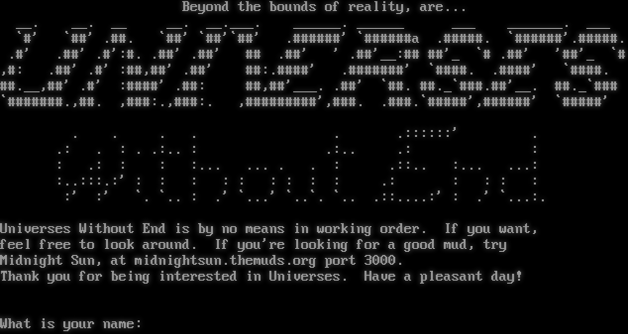 Beyond the bounds of reality, are... __. __. __ __. _โ€‹_.___. _โ€‹_____. _โ€‹_____ ___ _โ€‹______. ___ \`#' \`##' .โ€‹##. \`##' \`##'\`##' .โ€‹######' \`#โ€‹#####a .โ€‹#####. \`#โ€‹#####'.โ€‹#####. .#' .##' .#':#. .##' .##' ## .##' ' .##'__:## ##'_ \`# .##' '##'_ \`# ,#: .##' .#' :##,##' .##' ##:.โ€‹####' .โ€‹#######' \`#โ€‹###. .โ€‹####' \`#โ€‹###. #โ€‹#.__,##' .#' :#โ€‹###' .##: ##,##'_โ€‹__. .##' \`##. #โ€‹#._\`#โ€‹##.##'__. #โ€‹#._\`### \`#โ€‹######.,##. ,###:.,###:. ,#โ€‹########',#โ€‹##. .โ€‹###.\`#โ€‹####',#โ€‹#####' \`#โ€‹####' . . . . . .::::::' . .: . : . .:.. : .:.. .: : : .: : : :... ... . . : .::.. :... ...: :..:::.:' : : : : : : : : : .: : : : : :' :' \`. \`.. : .' \`...' \`..\`. \`.. .::.โ€‹...:' : .' \`...:. Universes Without End is by no means in working order. If you want, feel free to look around. If you're looking for a good mud, try Midnight Sun, at midnightsun.themuds.org port 3000. Thank you for being interested in Universes. Have a pleasant day! What is your name: