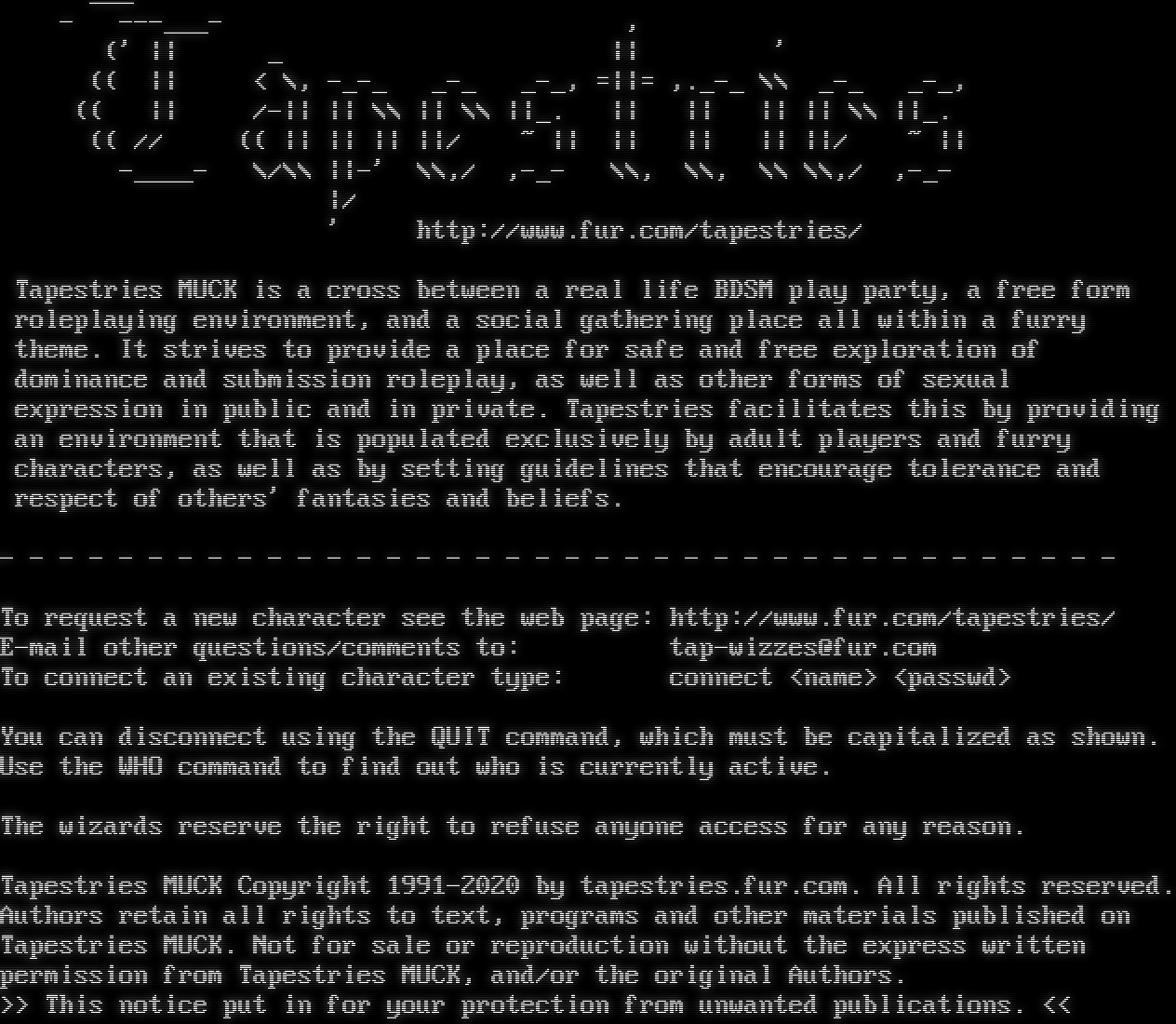 ___ - -โ€‹--___- , (' \|\| _ \|\| ' (( \|\| < \\, -โ€‹_-_ _-_ _-_, =\|\|= ,.โ€‹_-_ \\\\ _-_ _-_, (( \|\| /-\|\| \|\| \\\\ \|\| \\\\ \|\|_. \|\| \|\| \|\| \|\| \\\\ \|\|_. (( // (( \|\| \|\| \|\| \|\|/ ~ \|\| \|\| \|\| \|\| \|\|/ ~ \|\| -โ€‹____- \\/\\\\ \|\|-' \\\\,/ ,-_- \\\\, \\\\, \\\\ \\\\,/ ,-_- \|/ ' http://www.fur.com/tapestries/ Tapestries MUCK is a cross between a real life BDSM play party, a free form roleplaying environment, and a social gathering place all within a furry theme. It strives to provide a place for safe and free exploration of dominance and submission roleplay, as well as other forms of sexual expression in public and in private. Tapestries facilitates this by providing an environment that is populated exclusively by adult players and furry characters, as well as by setting guidelines that encourage tolerance and respect of others' fantasies and beliefs. - - - - - - - - - - - - - - - - - - - - - - - - - - - - - - - - - - - - - - To request a new character see the web page: http://www.fur.com/tapestries/ E-mail other questions/comments to: tap-wizzes@fur.com To connect an existing character type: connect <name> <passwd> You can disconnect using the QUIT command, which must be capitalized as shown. Use the WHO command to find out who is currently active. The wizards reserve the right to refuse anyone access for any reason. Tapestries MUCK Copyright 1991-2020 by tapestries.fur.com. All rights reserved. Authors retain all rights to text, programs and other materials published on Tapestries MUCK. Not for sale or reproduction without the express written permission from Tapestries MUCK, and/or the original Authors. >> This notice put in for your protection from unwanted publications. <<