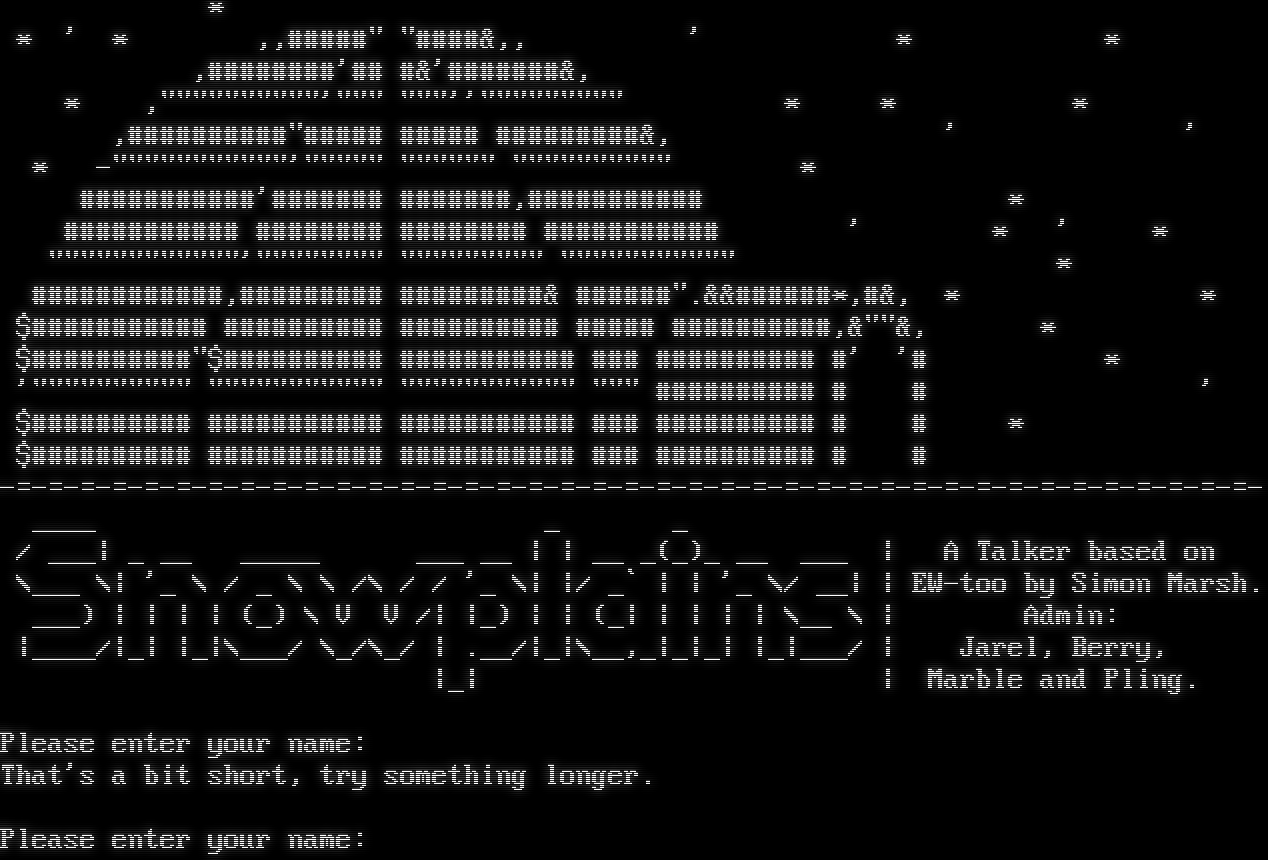 \* \* ' \* ,,#โ€‹####" "โ€‹####&,, ' \* \* ,#โ€‹#######'## #&'#โ€‹######&, \* ,"โ€‹"""""""""'""" """''"โ€‹"""""""" \* \* \* ,#โ€‹#########"##### #โ€‹#### #โ€‹########&, ' ' \* -โ€‹"""""""""""'"โ€‹"""" "โ€‹""""" "โ€‹""""""""" \* #โ€‹##########'#โ€‹###### #โ€‹######,#โ€‹########## \* #โ€‹########## #โ€‹####### #โ€‹####### #โ€‹########## ' \* ' \* "โ€‹"""""""""""'"โ€‹""""""" "โ€‹"""""""" "โ€‹"""""""""" \* #โ€‹###########,#โ€‹######## #โ€‹########& #โ€‹#####".&&#โ€‹#####\*,#&, \* \* $#โ€‹########## #โ€‹######### #โ€‹######### #โ€‹#### #โ€‹#########,&""&, \* $#โ€‹#########"$#โ€‹######### #โ€‹########## ### #โ€‹######### #' '# \* '"โ€‹""""""""" "โ€‹"""""""""" "โ€‹"""""""""" """ #โ€‹######### # # ' $#โ€‹######### #โ€‹########## #โ€‹########## ### #โ€‹######### # # \* $#โ€‹######### #โ€‹########## #โ€‹########## ### #โ€‹######### # # -โ€‹=-=-=-=-=-=-=-=-=-=-=-=-=-=-=-=-=-=-=-=-=-=-=-=-=-=-=-=-=-=-=-=-=-=-=-=-=-=-=- _โ€‹___ _ _ / ___\| _ __ _โ€‹____ ___ __ \| \| __ _(_)_ __ ___ \| A Talker based on \\___ \\\| '_ \\ / _ \\ \\ /\\ / / '_ \\\| \|/ _\` \| \| '_ \\/ __\| \| EW-too by Simon Marsh. ___) \| \| \| \| (_) \\ V V /\| \|_) \| \| (_\| \| \| \| \| \\__ \\ \| Admin: \|_โ€‹___/\|_\| \|_\|\\___/ \\_/\\_/ \| .__/\|_\|\\__,_\|_\|_\| \|_\|___/ \| Jarel, Berry, \|_\| \| Marble and Pling. Please enter your name: That's a bit short, try something longer. Please enter your name: