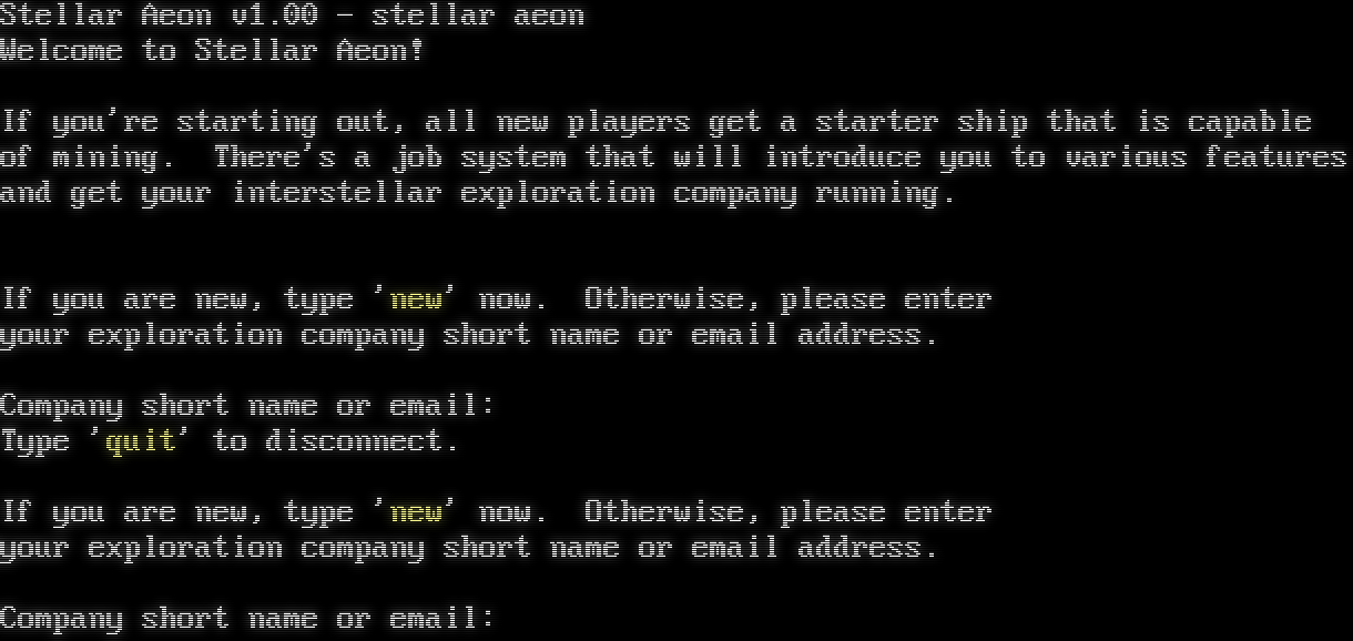 Stellar Aeon v1.00 - stellar aeon Welcome to Stellar Aeon! If you're starting out, all new players get a starter ship that is capable of mining. There's a job system that will introduce you to various features and get your interstellar exploration company running. If you are new, type 'new' now. Otherwise, please enter your exploration company short name or email address. Company short name or email: Type 'quit' to disconnect. If you are new, type 'new' now. Otherwise, please enter your exploration company short name or email address. Company short name or email: