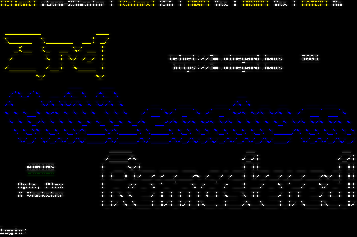 Attempting to Detect Client, Please Wait... [Client] xterm-256color \| [Colors] 256 \| [MXP] Yes \| [MSDP] Yes \| [ATCP] No _โ€‹_______ ___ \\_โ€‹____ \\_โ€‹_____ __\| _/ _(__ <_ __ \\/ __ \| / \\ \| \\/ /_/ \| telnet://3m.vineyard.haus 3001 /_โ€‹_____ /__\| \\_โ€‹___ \| https://3m.vineyard.haus \\/ \\/ ___ ___ /'\\_/\`\\ __ /\\_ \\ /\\_ \\ __ /\\ \\/\\_\\\\//\\ \\ \\//\\ \\ __ ___ ___ /\\_\\ __ __ ___ ___ \\ \\ \\__\\ \\/\\ \\ \\ \\ \\ \\ \\ \\ /'__\`\\/' _ \`\\ /' _ \`\\/\\ \\/\\ \\/\\ \\ /' __\` __\`\\ \\ \\ \\_/\\ \\ \\ \\ \\_\\ \\_ \\_\\ \\_/\\ __//\\ \\/\\ \\/\\ \\/\\ \\ \\ \\ \\ \\_\\ \\/\\ \\/\\ \\/\\ \\ \\ \\_\\\\ \\_\\ \\_\\/\\_โ€‹___\\/\\_โ€‹___\\ \\_โ€‹___\\ \\_\\ \\_\\ \\_\\ \\_\\ \\_\\ \\_โ€‹___/\\ \\_\\ \\_\\ \\_\\ \\/_/ \\/_/\\/_/\\/_โ€‹___/\\/_โ€‹___/\\/_โ€‹___/\\/_/\\/_/\\/_/\\/_/\\/_/\\/___/ \\/_/\\/_/\\/_/ _โ€‹____ __ __ /_โ€‹___/\\ /_/\| /_/\| ADMINS \| __ \\/\|___ _โ€‹___ ___ __ _ __\| \|\|__ __ _ __ ___ _\| \|\| ~โ€‹~~~~~ \| \|__) \|/__/_/__/___/\\ /_ / /__\| \|/_/__/_/__/___/\\/_\| \|\| Opie, Plex \| _ // _ \\ '_ \` _ \\ / _\` / __\| __/ _ \\ '__/ _ \\/ _\` \|\| & Veekster \| \| \\ \\ __/ \| \| \| \| \| (_\| \\__ \\ \|\| __/ \| \| __/ (_\| \|\| \|_\|/ \\_\\___\|_\|/\|_\|/\|_\|\\__,_\|___/\\__\\___\|_\|/ \\___\|\\__,_\|/ Login: