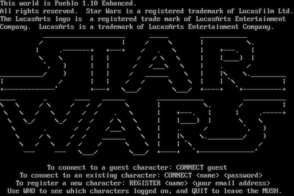 This world is Pueblo 1.10 Enhanced. All rights reserved. Star Wars is a registered trademark of Lucasfilm Ltd. The LucasArts logo is a registered trade mark of LucasArts Entertainment Company. LucasArts is a trademark of LucasArts Entertainment Company. _โ€‹____________________ _โ€‹____ _โ€‹___________ / \| / \\ \| \\. \| .โ€‹-------+ +โ€‹---+ / . \\ \| +โ€‹---. \| \\ \\ \| \| / / \\ \\ \| \|_โ€‹___) \| \`, ) \| \| / /___\\ \\ \| . / _โ€‹__________/ ) \| \| / _โ€‹_____ \\ \| \|\\ \\.โ€‹_________ \| / \| \| / / \\ \\ \| \| \`\\ \| +โ€‹-------------' +โ€‹---+ \\___/ \\___/ +โ€‹----+ \`+โ€‹----------+ _โ€‹___ _ _โ€‹___ _โ€‹_____ _โ€‹___________ _โ€‹__________ \\ \\ / \\ / / / \\ \| \\. / \| \\ \\ / \\ / / / . \\ \| +โ€‹---. \| \| .โ€‹-----+ \\ \\_/ \\_/ / / / \\ \\ \| \|_โ€‹___) \| \\ \\ \\ . / / /___\\ \\ \| . / \`, ) \\ / \\ / / _โ€‹_____ \\ \| \|\\ \\.โ€‹_________/ ) \\ / \\ / / / \\ \\ \| \| \`\\ / --- --- \\___/ \\___/ +โ€‹----+ \`+โ€‹--------------' To connect to a guest character: CONNECT guest To connect to an existing character: CONNECT <name> <password> To register a new character: REGISTER <name> <your email address> Use WHO to see which characters logged on, and QUIT to leave the MUSH.