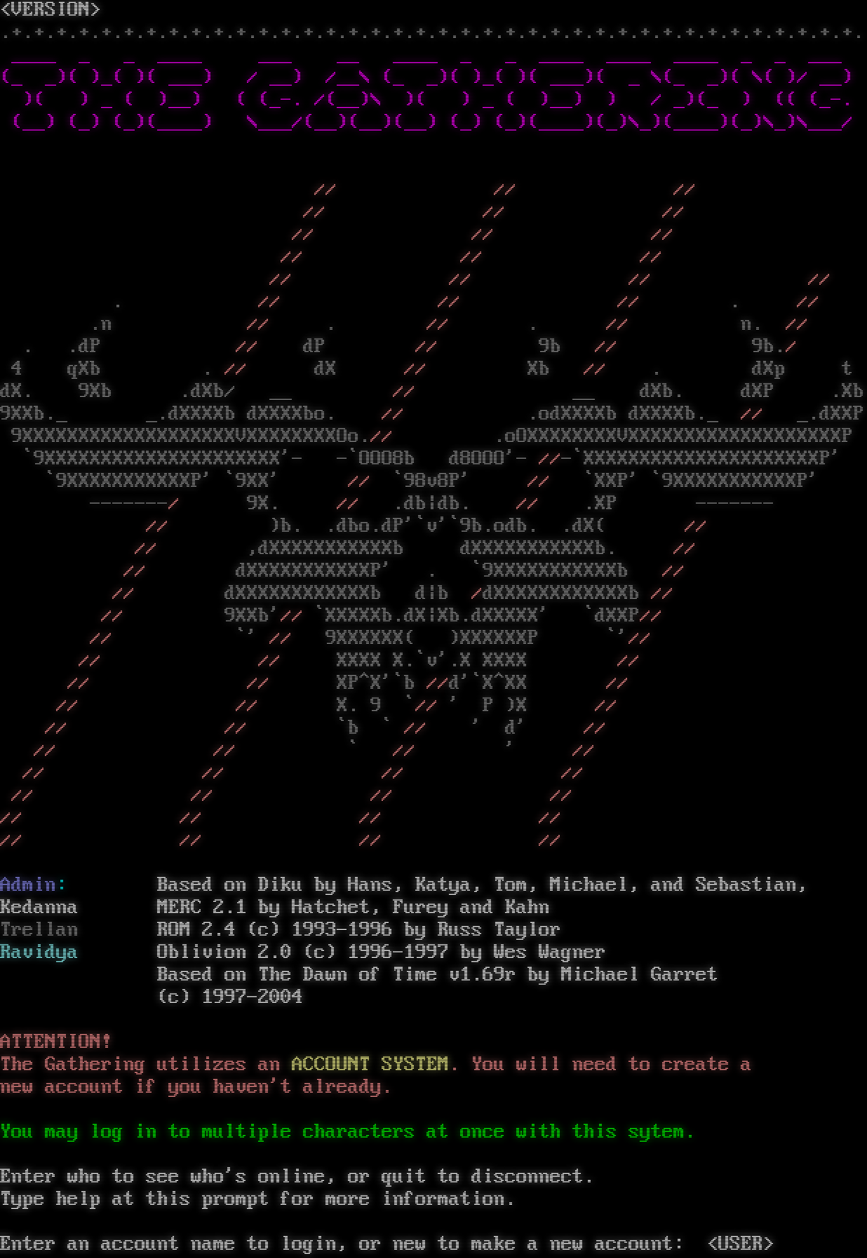 <VERSION> .โ€‹+.+.+.+.+.+.+.+.+.+.+.+.+.+.+.+.+.+.+.+.+.+.+.+.+.+.+.+.+.+.+.+.+.+.+.+.+.+. _โ€‹___ _ _ _โ€‹___ ___ __ _โ€‹___ _ _ _โ€‹___ _โ€‹___ _โ€‹___ _ _ ___ (_ _)( )_( )( ___) / __) /__\\ (_ _)( )_( )( ___)( _ \\(_ _)( \\( )/ __) )( ) _ ( )__) ( (_-. /(__)\\ )( ) _ ( )__) ) / _)(_ ) (( (_-. (__) (_) (_)(_โ€‹___) \\___/(__)(__)(__) (_) (_)(_โ€‹___)(_)\\_)(_โ€‹___)(_)\\_)\\___/ // // // // // // // // // // // // // // // // . // // // . // .n // . // . // n. // . .dP // dP // 9b // 9b./ 4 qXb . // dX // Xb // . dXp t dX. 9Xb .dXb/ __ // __ dXb. dXP .Xb 9XXb._ _.dXXXXb dXXXXbo. // .odXXXXb dXXXXb._ // _.dXXP 9XXXXXXXXXXXXXXXXXXXVXXXXXXXXOo.// .oOXXXXXXXXVXXXXXXXXXXXXXXXXXXXP \`9XXXXXXXXXXXXXXXXXXXXX'- -\`OOO8b d8OOO'- //-\`XXXXXXXXXXXXXXXXXXXXXP' \`9XXXXXXXXXXXP' \`9XX' // \`98v8P' // \`XXP' \`9XXXXXXXXXXXP' -โ€‹------/ 9X. // .db\|db. // .XP -โ€‹------ // )b. .dbo.dP'\`v'\`9b.odb. .dX( // // ,dXXXXXXXXXXXb dXXXXXXXXXXXb. // // dXXXXXXXXXXXP' . \`9XXXXXXXXXXXb // // dXXXXXXXXXXXXb d\|b /dXXXXXXXXXXXXb // // 9XXb'// \`XXXXXb.dX\|Xb.dXXXXX' \`dXXP// // \`' // 9XXXXXX( )XXXXXXP \`'// // // XXXX X.\`v'.X XXXX // // // XP^X'\`b //d'\`X^XX // // // X. 9 \`// ' P )X // // // \`b \` // ' d' // // // \` // ' // // // // // // // // // // // // // // // // // Admin: Based on Diku by Hans, Katya, Tom, Michael, and Sebastian, Kedanna MERC 2.1 by Hatchet, Furey and Kahn Trellan ROM 2.4 (c) 1993-1996 by Russ Taylor Ravidya Oblivion 2.0 (c) 1996-1997 by Wes Wagner Based on The Dawn of Time v1.69r by Michael Garret (c) 1997-2004 ATTENTION! The Gathering utilizes an ACCOUNT SYSTEM. You will need to create a new account if you haven't already. You may log in to multiple characters at once with this sytem. Enter who to see who's online, or quit to disconnect. Type help at this prompt for more information. Enter an account name to login, or new to make a new account: <USER>