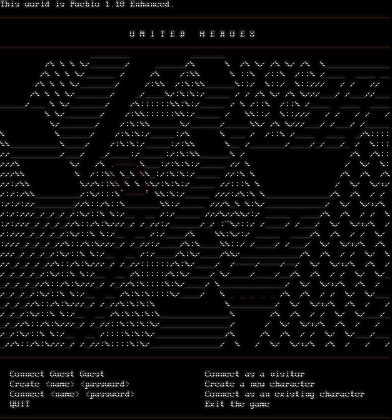 This world is Pueblo 1.10 Enhanced. _โ€‹_____________________________________________________________________________ U N I T E D H E R O E S _โ€‹_____________________________________________________________________________ _โ€‹_______ _โ€‹______ /\\ \\ \\ \\/_โ€‹______/ _โ€‹_____/\\ \\ /\\ \\/ /\\ \\/ /\\ \\_โ€‹____________ /\\ \\ \\ \\/_โ€‹_____ / /\\ /:\\\\ \\ ::\\ /::\\ /::\\ /_โ€‹___ _โ€‹___ __ /\\ \\ \\ \\/_โ€‹______/ /:\\\\ /:\\:\\\\_โ€‹_____\\::/ \\::/ \\::/// / / // /\\ \\ \\ \\/_โ€‹______/ _/_โ€‹___\\/:\\:\\:/_โ€‹____ / / /\\ \\/ /\\ \\///___/ /___//___ _โ€‹____/___ \\ \\/_โ€‹______/ /\\::::::\\\\:\\:/_โ€‹____ / \\ /::\\ /::\\ /_โ€‹___ _โ€‹___ _โ€‹___ \\ \\/_โ€‹______/ /:\\\\::::::\\\\:/_โ€‹____ / \\\\::/ \\::/// / / / / / \\/_โ€‹______/ /:\\:\\\\_โ€‹_____\\/_โ€‹_____/_โ€‹____\\\\/ /\\ \\///___/ /___/ /_โ€‹____ \\ \\_โ€‹_____/ /:\\:\\:/_โ€‹____:/\\ \\ ___ / /::\\ /_โ€‹___ _โ€‹___ _/\\:::: \\\\_โ€‹_________\\_โ€‹___/ /:\\:\\:/_โ€‹____:/:\\\\ \\__ /_โ€‹______/_โ€‹___/_/___/_ / \\::: //_โ€‹_________/___/ _/_โ€‹___:/_โ€‹____:/:\\:\\\\_โ€‹_____\\ / /\\ /\\:: ///\\ \\/ /\\ .โ€‹----.\\___:/:\\:\\:/_โ€‹____ // \\ / \\/ \\: ///\\\\ \\ /::\\\\ \\_\\ \\\\_:/:\\:\\:/_โ€‹____ //:\\ \\ /\\ /\\ /\\ //:/\\\\ \\//\\::\\\\ \\ \\ \\\\/:\\:\\:/_โ€‹____ //:::\\ \\ / \\/ \\/+/ /:/:/\\\\_โ€‹________/:\\/:::\\\`-โ€‹---' \\\\:\\:/_โ€‹____ ///:/\\:\\ \\_โ€‹____________/\\ /\\ / / :/:/://_โ€‹_______//\\::/\\::\\_โ€‹______\\\\:/_โ€‹____ ///\\_\\ \\:\\/_โ€‹___________/ \\/ \\/+/\\ /:/:///_/_/_/_/:\\/::\\ \\:/__ __ /:/_โ€‹____ ///\\//\\\\/:/ _โ€‹____ _โ€‹___/\\ /\\ / / \\ :/:///_/_/_/_//\\::/\\:\\///_/ /_//:/_โ€‹_____/_/ :~\\/::/ /_โ€‹___/ /___/ \\/ \\/+/\\ / /:///_/_/_/_/:\\/::\\ \\:/__ __ /:/_โ€‹___/\\ \\\\:\\/:/ _โ€‹____ _โ€‹___/\\ /\\ / / \\/ :///_/_/_/_//\\::/\\:\\///_/ /_//:/_โ€‹___/\\:\\_โ€‹___\\\\::/ /_โ€‹___/ /___/ \\/ \\/+/\\ /\\ ///_/_/_/_/:\\/::\\ \\:/__ __ /:/_โ€‹___/\\:\\/_โ€‹___/\\\\/_โ€‹___________/\\ /\\ / / \\/ \\ //_/_/_/_//\\::/\\:\\///_/ /_//::::::/\\:\\/_โ€‹___/ /-โ€‹---/-โ€‹---/--/ \\/ \\/+/\\ /\\ / /_/_/_/_/:\\/::\\ \\:/__ __ /\\:::::/\\:\\/_โ€‹___/ \\/_โ€‹___/_โ€‹___/__/\\ /\\ / / \\/ \\/_ _/_/_/_//\\::/\\:\\///_/ /_//\\:\\::::\\:\\/_โ€‹___/ \\_โ€‹____________/ \\/ \\/+/\\ /\\ / /_/_/_/:\\/::\\ \\:/__ __ /\\:\\:\\::::\\/_โ€‹___/ \\ _ _ _ _ _ /\\ /\\ / / \\/ \\/___ _/_/_//\\::/\\:\\///_/ /_//\\:\\:\\:\\ \\_โ€‹________/ \\/ \\/+/\\ /\\ / / /_/_/:\\/::\\ \\:/__ __ /\\:\\:\\:\\:\\_โ€‹_____________\\ /\\ /\\ / / \\/ \\/___/_ _/_//\\::/\\:\\///_/ /_//::\\:\\:\\:\\/_โ€‹_____________/ / \\/ \\/+/\\ /\\ / / /_/:\\/::\\ \\:/__ __ /::::\\:\\:\\/_โ€‹_____________/\\ /\\ /\\ / / \\/ \\/___/___ _//\\::/\\:\\///_/ /_//:\\::::\\:\\/_โ€‹_____________/ \\ / \\/ \\/+/\\ /\\ / / / _โ€‹_____________________________________________________________________________ Connect Guest Guest Connect as a visitor Create <name> <password> Create a new character Connect <name> <password> Connect as an existing character QUIT Exit the game _โ€‹____________________________________________________________________________\_