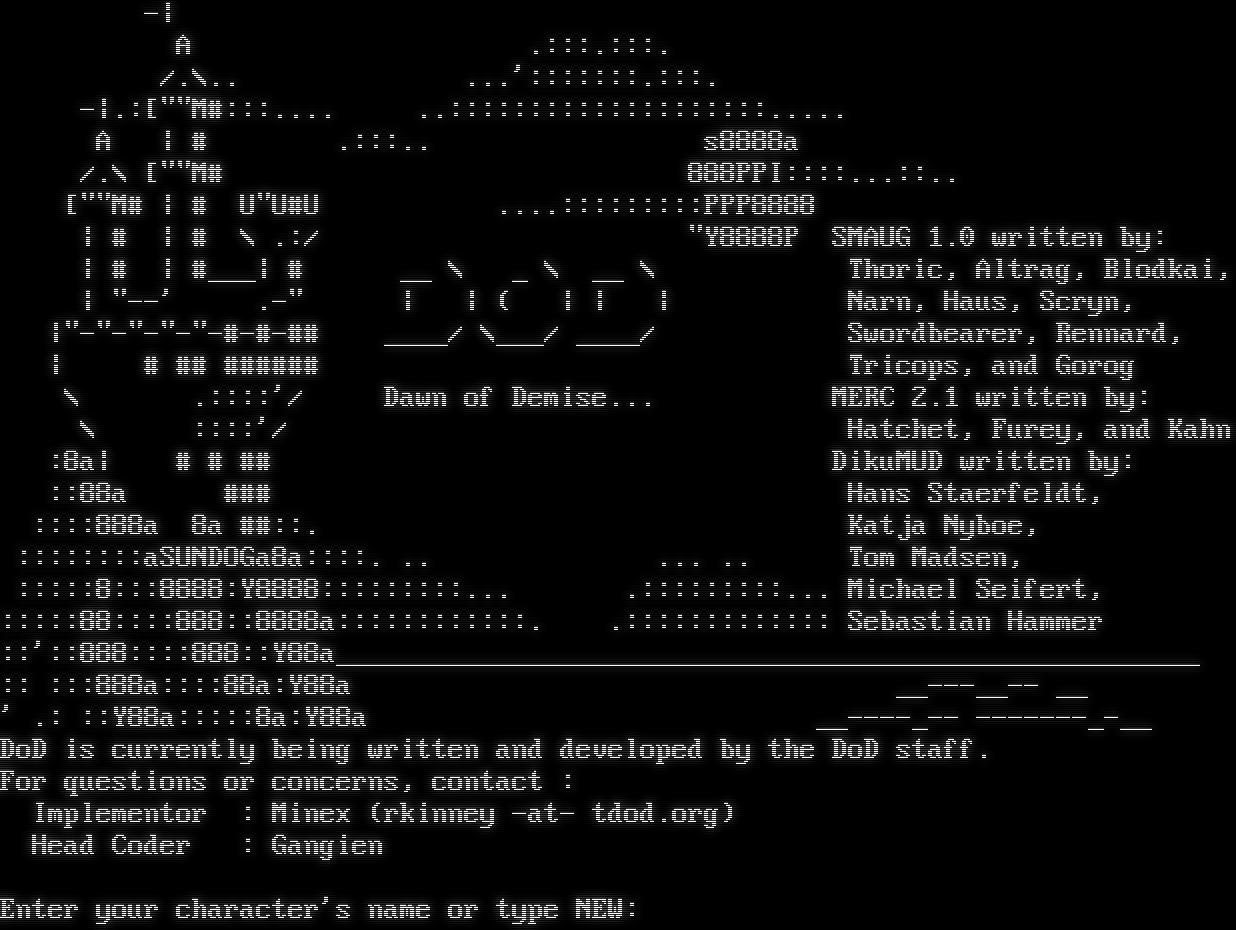 -\| A .:::.:::. /.\\.. ...':::::::.:::. -\|.:[""M#:::.โ€‹... ..::::::::::::::::::::.โ€‹.... A \| # .:::.. s8888a /.\\ [""M# 888PPI::::...::.. [""M# \| # U"U#U .โ€‹...:::::::::PPP8888 \| # \| # \\ .:/ "Y8888P SMAUG 1.0 written by: \| # \| #โ€‹___\| # __ \\ _ \\ __ \\ Thoric, Altrag, Blodkai, \| "--' .-" \| \| ( \| \| \| Narn, Haus, Scryn, \|"โ€‹-"-"-"-"-#-#-## _โ€‹___/ \\___/ _โ€‹___/ Swordbearer, Rennard, \| # ## #โ€‹##### Tricops, and Gorog \\ .::::'/ Dawn of Demise... MERC 2.1 written by: \\ ::::'/ Hatchet, Furey, and Kahn :8a\| # # ## DikuMUD written by: ::88a ### Hans Staerfeldt, ::::888a 8a ##::. Katja Nyboe, ::::::::aSUNDOGa8a::::. .. ... .. Tom Madsen, :::::8:::8888:Y8888:::::::::... .:::::::::... Michael Seifert, :::::88::::888::8888a::::::::::::. .::::::::::::: Sebastian Hammer ::'::888::::888::Y88a_โ€‹_____________________________________________________ :: :::888a::::88a:Y88a _โ€‹_---__-- __ ' .: ::Y88a:::::8a:Y88a _โ€‹_----_-- -โ€‹------_-__ DoD is currently being written and developed by the DoD staff. For questions or concerns, contact : Implementor : Minex (rkinney -at- tdod.org) Head Coder : Gangien Enter your character's name or type NEW: