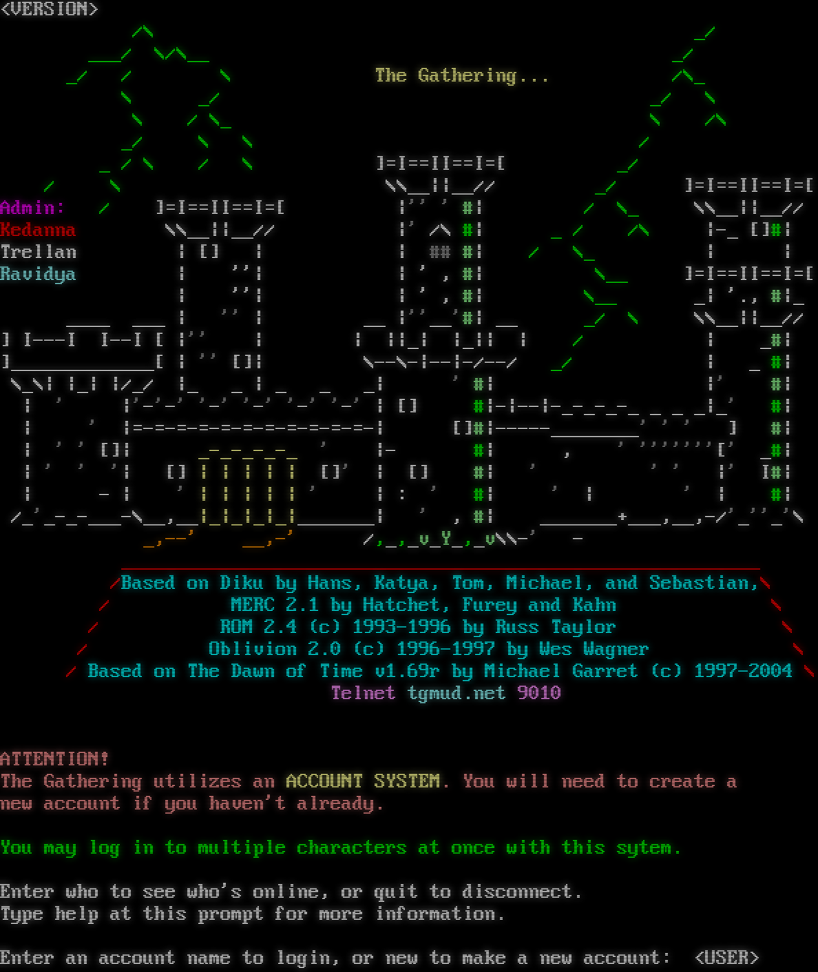 <VERSION> /\\ _/ ___/ \\/\\__ _/ _/ / \\ The Gathering... /\\_ \\ _/ _/ \\ \\ / \\_ \\ /\\ _/ \\ \\ / _ / \\ / \\ ]=I==II==I=[ _/ / \\ \\\\__\|\|__// _/ ]=I==II==I=[ Admin: / ]=I==II==I=[ \|'' ' #\| / \\_ \\\\__\|\|__// Kedanna \\\\__\|\|__// \|' /\\ #\| _ / /\\ \|-_ []#\| Trellan \| [] \| \| ## #\| / \\_ \| \| Ravidya \| ''\| \| ' , #\| \\__ ]=I==II==I=[ \| ''\| \| ' , #\| \\__ _\| '., #\|_ _โ€‹___ ___ \| '' \| __ \|''__'#\| __ _/ \\ \\\\__\|\|__// ] I---I I--I [ \|'' \| \| \|\|_\| \|_\|\| \| / \| _#\| ]_โ€‹____________[ \| '' []\| \\--\\-\|--\|-/--/ _/ \| _ #\| \\_\\\| \|_\| \|/_/ \|_ _ \| _ _ _\| ' #\| \|' #\| \| ' \|'-'-' '-' '-' '-' '-' \| [] #\|-\|--\|-โ€‹_-_-_-_ _ _ _\|_' #\| \| ' \|=โ€‹-=-=-=-=-=-=-=-=-=-=-\| []#\|-โ€‹----________' ' ' ] #\| \| ' ' []\| _โ€‹-_-_-_-_ ' \|- #\| , ' '''''''[' _#\| \| ' ' '\| [] \| \| \| \| \| []' \| [] #\| ' ' ' \|' I#\| \| - \| ' \| \| \| \| \| ' \| : ' #\| ' \| ' \| #\| /_'_โ€‹-_-___-\\__,__\|_\|_\|_\|_\|_โ€‹______\| ' , #\| _โ€‹______+___,__,-/'_''_'\\ _,--' __,-' /,_,_v_Y_,_v\\\\-' - _โ€‹_________________________________________________________ /Based on Diku by Hans, Katya, Tom, Michael, and Sebastian,\\ / MERC 2.1 by Hatchet, Furey and Kahn \\ / ROM 2.4 (c) 1993-1996 by Russ Taylor \\ / Oblivion 2.0 (c) 1996-1997 by Wes Wagner \\ / Based on The Dawn of Time v1.69r by Michael Garret (c) 1997-2004 \\ Telnet tgmud.net 9010 ATTENTION! The Gathering utilizes an ACCOUNT SYSTEM. You will need to create a new account if you haven't already. You may log in to multiple characters at once with this sytem. Enter who to see who's online, or quit to disconnect. Type help at this prompt for more information. Enter an account name to login, or new to make a new account: <USER>