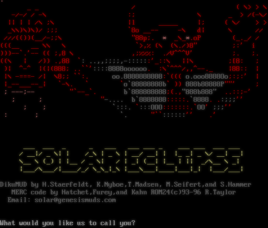 . _ _ / ( \\> > \\ -/-/ / -\\ :; \\ _ > /(-\\/ \|\| \| \| /\\ ;\\ \|l _โ€‹____ \|; ( \\/ > > _\\\\)\\)\\)/ ;;; \`8o _โ€‹_-- -\\ d\| \\ // ///(())(__/-;;\\ "88p;. \* _\\_\*.oP (_._/ / (((__ __ \\\\ \\ \`>,% (\\ (\\./)8" ;:' i )))--\`.'-- (( ;,8 \\ ,;%%%: ./V^^^V' ;. ;. ((\\ \| /)) .,88 \`: ..,,;;;;,-::::::'_::\\ \|\|\\ ;[8: ; )\| ^-^ \|(\|(888; ..\`\`'::::8888oooooo. :\\\`^^^/,,^โ€‹--._ \|88:: \| \|\\ -โ€‹===- /\| \\8;; \`\`:. oo.8888888888:\`((( o.ooo8888Oo;:;:' \| \|_โ€‹--___--_\| \`-\\. \` \`o\`88888888b\` )) 888b88888P""' ; ; ---;-- "\`--_\`. b\`888888888;(.,"888b888" ..::;-' ; ; "โ€‹-.... b\`8888888:::::.\`8888. .:;;;'' ; ; \`:::. \`:::OOO:::::::.\`OO' ;;;'' : ; \`. "\`\`::::::'' .' ___ ___ _ _ ___ ___ ___ _ ___ ___ ___ ___ / __\|/ _ \\\| \| /_\\ \| _ \\ \| __/ __\| \| \|_ _\| _ \\/ __\| __\| \\__ \\ (_) \| \|__ / _ \\\| / \| _\| (__\| \|__ \| \|\| _/\\__ \\ _\| \|___/\\___/\|_โ€‹___/_/ \\_\\_\|_\\ \|___\\___\|_โ€‹___\|___\|_\| \|___/___\| DikuMUD by H.Staerfeldt, K.Nyboe,T.Madsen, M.Seifert,and S.Hammer MERC code by Hatchet,Furey,and Kahn ROM24(c)93-96 R.Taylor Email: solar@genesismuds.com What would you like us to call you?