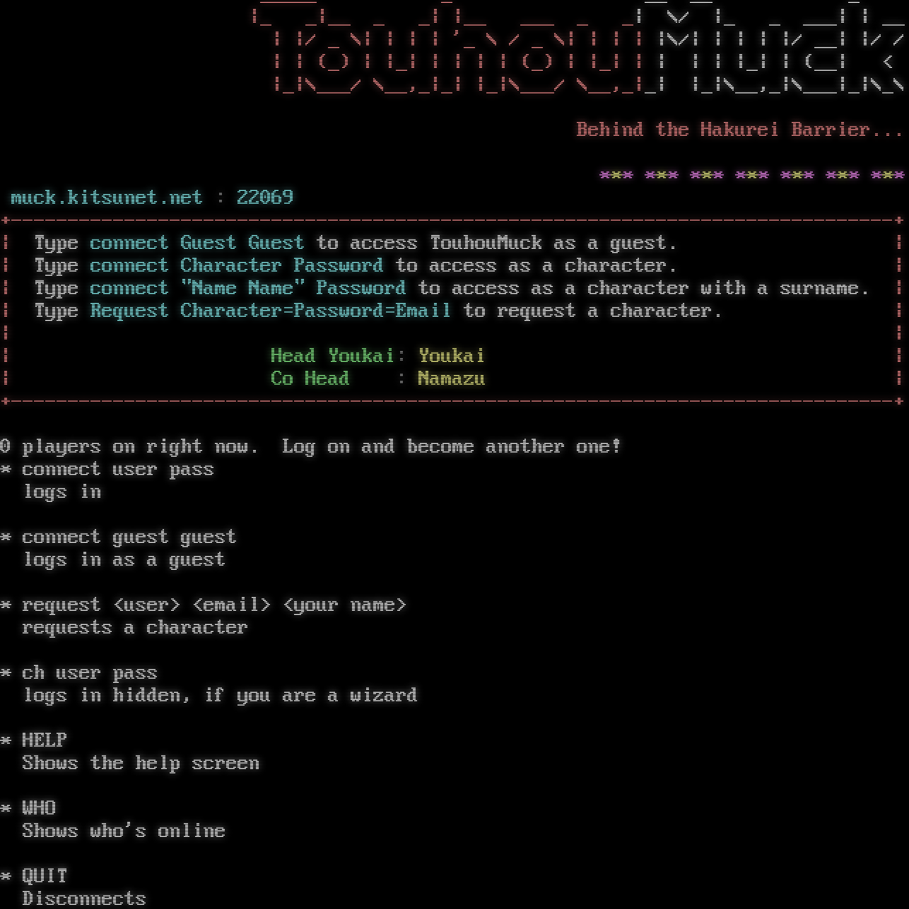 _โ€‹____ _ __ __ _ \|_ _\|__ _ _\| \|__ ___ _ _\| \\/ \|_ _ ___\| \| __ \| \|/ _ \\\| \| \| \| '_ \\ / _ \\\| \| \| \| \|\\/\| \| \| \| \|/ __\| \|/ / \| \| (_) \| \|_\| \| \| \| \| (_) \| \|_\| \| \| \| \| \|_\| \| (__\| < \|_\|\\___/ \\__,_\|_\| \|_\|\\___/ \\__,_\|_\| \|_\|\\__,_\|\\___\|_\|\\_\\ Behind the Hakurei Barrier... \*\*\* \*\*\* \*\*\* \*\*\* \*\*\* \*\*\* \*\*\* muck.kitsunet.net : 22069 +โ€‹------------------------------------------------------------------------------+ \| Type connect Guest Guest to access TouhouMuck as a guest. \| \| Type connect Character Password to access as a character. \| \| Type connect "Name Name" Password to access as a character with a surname. \| \| Type Request Character=Password=Email to request a character. \| \| \| \| Head Youkai: Youkai \| \| Co Head : Namazu \| +โ€‹------------------------------------------------------------------------------+ 0 players on right now. Log on and become another one! \* connect user pass logs in \* connect guest guest logs in as a guest \* request <user> <email> <your name> requests a character \* ch user pass logs in hidden, if you are a wizard \* HELP Shows the help screen \* WHO Shows who's online \* QUIT Disconnects