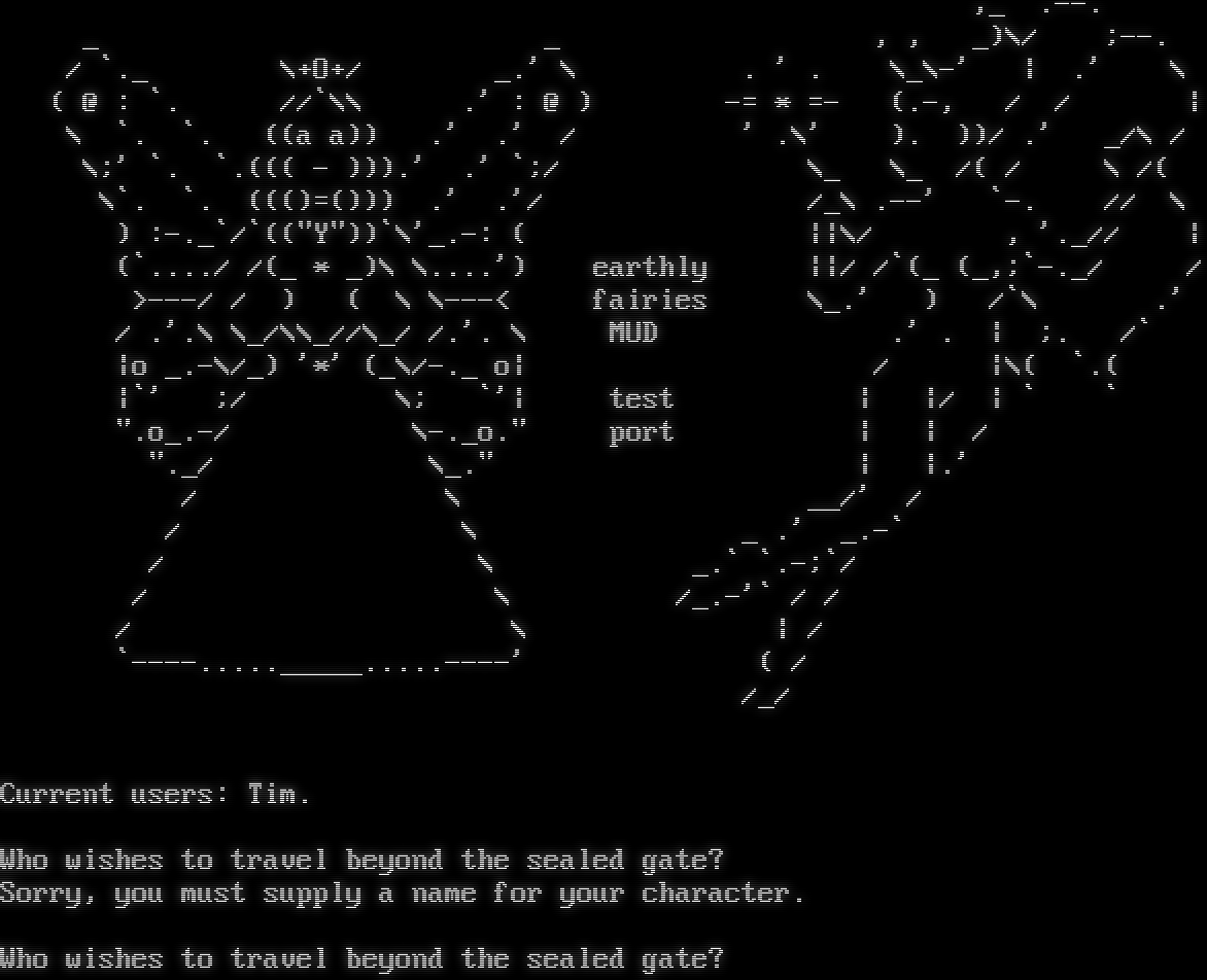 ,_ .โ€‹--. _ _ , , _)\\/ ;--. / \`._ \\+O+/ _.' \\ . ' . \\_\\-' \| .' \\ ( @ : \`. //\`\\\\ .' : @ ) -= \* =- (.-, / / \| \\ \`. \`. ((a a)) .' .' / ' .\\' ). ))/ .' _/\\ / \\;' \`. \`.((( - ))).' .' \`;/ \\_ \\_ /( / \\ /( \\\`. \`. ((()=())) .' .'/ /_\\ .--' \`-. // \\ ) :-._\`/\`(("Y"))\`\\'_.-: ( \|\|\\/ , '._// \| (\`.โ€‹.../ /(_ \* _)\\ \\.โ€‹...') earthly \|\|/ /\`(_ (_,;\`-._/ / >---/ / ) ( \\ \\---< fairies \\_.' ) /\`\\ .' / .'.\\ \\_/\\\\_//\\_/ /.'. \\ MUD .' . \| ;. /\` \|o _.-\\/_) '\*' (_\\/-._ o\| / \|\\( \`.( \|\`' ;/ \\; \`'\| test \| \|/ \| \` \` ".o_.-/ \\-._o." port \| \| / "._/ \\_." \| \|.' / \\ __/' / / \\ _ .' _.-\` / \\ _.\` \`.-;\`/ / \\ /_.-'\` / / / \\ \| / \`-โ€‹---....._____.....----' ( / /_/ Current users: Tim. Who wishes to travel beyond the sealed gate? Sorry, you must supply a name for your character. Who wishes to travel beyond the sealed gate?