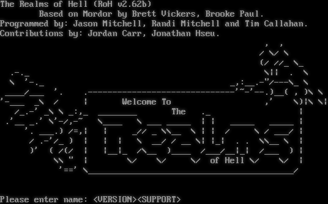 The Realms of Hell (RoH v2.62b) Based on Mordor by Brett Vickers, Brooke Paul. Programmed by: Jason Mitchell, Randi Mitchell and Tim Callahan. Contributions by: Jordan Carr, Jonathan Hseu. , , / \\/ \\ (/ //_ \\_ .โ€‹-._ \\\|\| . \\ \\ '-._ _,:_โ€‹_.-"/---\\_ \\ _โ€‹___/___ '. .โ€‹------------------------------'~-'--.)__( , )\\ \\ '-โ€‹___ _\\ / \| Welcome To ,' \\)\|\\ \\\| /_.-' _\\ \\ _:,_ _โ€‹_______ The ._ \| .'__ _.' \\'-/,-~ \\_โ€‹___ \\ ___ _โ€‹____ \| \| _โ€‹____ _โ€‹____ \| '. _โ€‹__.) /=,\| \| _// _ \\\\__ \\ \| \| / \\ / ___/ \| / .-'/_ ) \| \| \| \\ __/ / __ \\\| \|_\| . . \\\\__ \\ \| )' ( /(/ \| \|__\|_ /\\__ )_โ€‹___ /___/__\|_\| /___ ) \| \\\\ " \| \\/ \\/ \\/ of Hell \\/ \\/ \| '==' \\_โ€‹_________________________________________/ Please enter name: <VERSION><SUPPORT><!ELEMENT brown "<COLOR #95601A>"><!ELEMENT cerulean "<COLOR #009CFF>"><!ELEMENT darkgrey "<COLOR #484848>"><!ELEMENT gold "<COLOR #FFD700>"><!ELEMENT pink "<COLOR #FF5ADE>"><!ELEMENT player "<send href='tell &Name; ' hint='Send a message to &Name;' PROMPT>" ATT='Name'><!ELEMENT skyblue "<COLOR #82E6FF>">