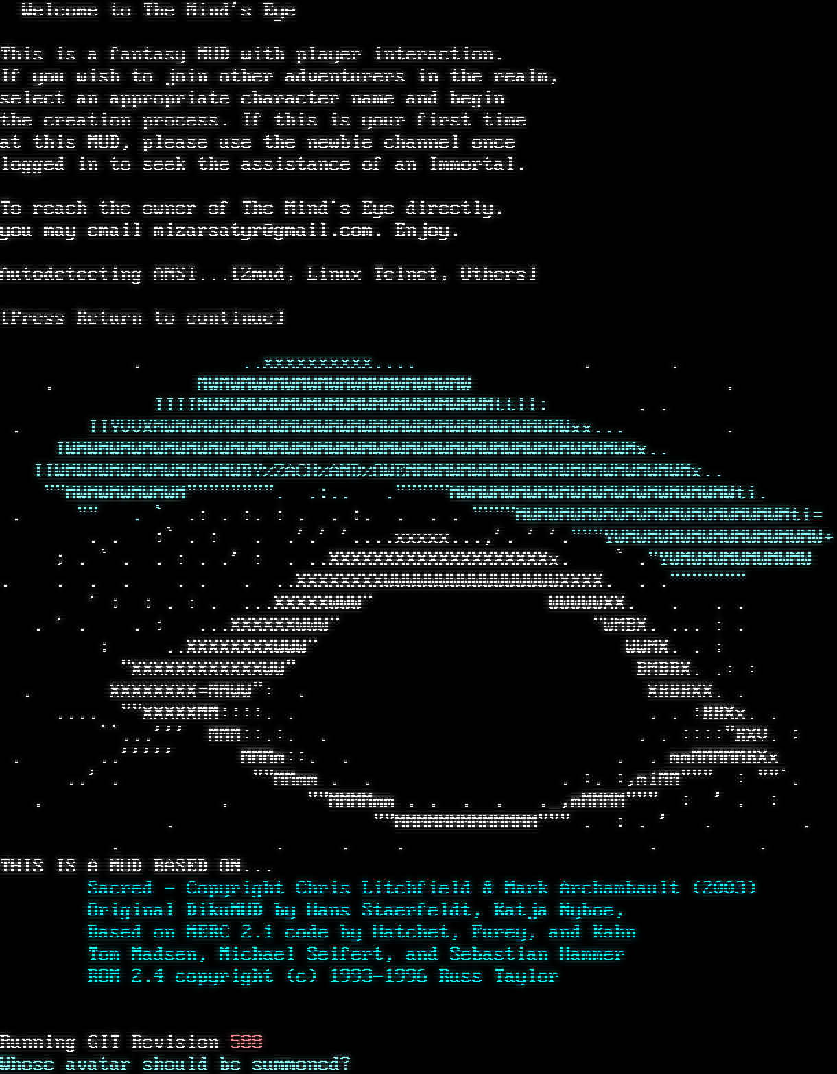 Welcome to The Mind's Eye This is a fantasy MUD with player interaction. If you wish to join other adventurers in the realm, select an appropriate character name and begin the creation process. If this is your first time at this MUD, please use the newbie channel once logged in to seek the assistance of an Immortal. To reach the owner of The Mind's Eye directly, you may email mizarsatyr@gmail.com. Enjoy. Autodetecting ANSI...[Zmud, Linux Telnet, Others] [Press Return to continue] . ..xxxxxxxxxx.โ€‹... . . . MWMWMWWMWMWMWMWMWMWMWMWMW . IIIIMWMWMWMWMWMWMWMWMWMWMWMWMWMttii: . . . IIYVVXMWMWMWMWMWMWMWMWMWMWMWMWMWMWMWMWMWMWMWxx... . IWMWMWMWMWMWMWMWMWMWMWMWMWMWMWMWMWMWMWMWMWMWMWMWMWMWMx.. IIWMWMWMWMWMWMWMWMWBY%ZACH%AND%OWENMWMWMWMWMWMWMWMWMWMWMWMWMx.. ""MWMWMWMWMWM"โ€‹""""""". .:.. .โ€‹"""""MWMWMWMWMWMWMWMWMWMWMWMWMWti. . "" . \` .: . :. : . . :. . . . "โ€‹"""MWMWMWMWMWMWMWMWMWMWMWMWMti= . . :\` . : . .'.' '.โ€‹...xxxxx...,'. ' '.โ€‹"""YWMWMWMWMWMWMWMWMWMW+ ; . \` . . : . .' : . ..XXXXXXXXXXXXXXXXXXXXx. \` ."YWMWMWMWMWMWMW . . . . . . . ..XXXXXXXXWWWWWWWWWWWWWWWWXXXX. . .โ€‹""""""" ' : : . : . ...XXXXXWWW" W88N88@888888WWWWWXX. . . . . ' . . : ...XXXXXXWWW" M88N88GGGGGG888^8M "WMBX. ... : . : ..XXXXXXXXWWW" M88888WWRWWWMW8oo88M WWMX. . : "XXXXXXXXXXXXWW" WN8888WWWWW W8@@@8M BMBRX. .: : . XXXXXXXX=MMWW": . W8N888WWWWWWWW88888W XRBRXX. . .โ€‹... ""XXXXXMM::::. . W8@889WWWWWM8@8N8W . . :RRXx. . \`\`...''' MMM::.:. . W888N89999888@8W . . ::::"RXV. : . ..''''' MMMm::. . WW888N88888WW . . mmMMMMMRXx ..' . ""MMmm . . WWWWWWW . :. :,miMM""" : ""\`. . . ""MMMMmm . . . . ._,mMMMM""" : ' . : . ""MMMMMMMMMMMMM""" . : . ' . . . . . . . . THIS IS A MUD BASED ON... Sacred - Copyright Chris Litchfield & Mark Archambault (2003) Original DikuMUD by Hans Staerfeldt, Katja Nyboe, Based on MERC 2.1 code by Hatchet, Furey, and Kahn Tom Madsen, Michael Seifert, and Sebastian Hammer ROM 2.4 copyright (c) 1993-1996 Russ Taylor Running GIT Revision 588 Whose avatar should be summoned?
