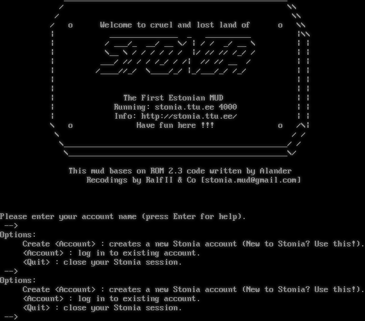_โ€‹________________________________________________ / \\\\ / \\\\ / o Welcome to cruel and lost land of o \\\\ \| _โ€‹______________ _ _โ€‹_________ \|\\\\ \| / ___/_ __/ __ \\/ \| / / _/ __ \\ \| \| \| \\__ \\ / / / / / / \|/ // // /_/ / \| \| \| ___/ // / / /_/ / /\| // // __ / \| \| \| /_โ€‹___//_/ \\_โ€‹___/_/ \|_/___/_/ /_/ \| \| \| \| \| \| \| \| \| The First Estonian MUD \| \| \| Running: stonia.ttu.ee 4000 \| \| \| Info: http://stonia.ttu.ee/ \| \| \\ o Have fun here !!! o /\\\| \\ / / \\_โ€‹________________________________________________/ / \\_โ€‹_______________________________________________\\/ This mud bases on ROM 2.3 code written by Alander Recodings by RalfII & Co [stonia.mud@gmail.com] Please enter your account name (press Enter for help). --> Options: Create <Account> : creates a new Stonia account (New to Stonia? Use this!). <Account> : log in to existing account. <Quit> : close your Stonia session. --> Options: Create <Account> : creates a new Stonia account (New to Stonia? Use this!). <Account> : log in to existing account. <Quit> : close your Stonia session. -->