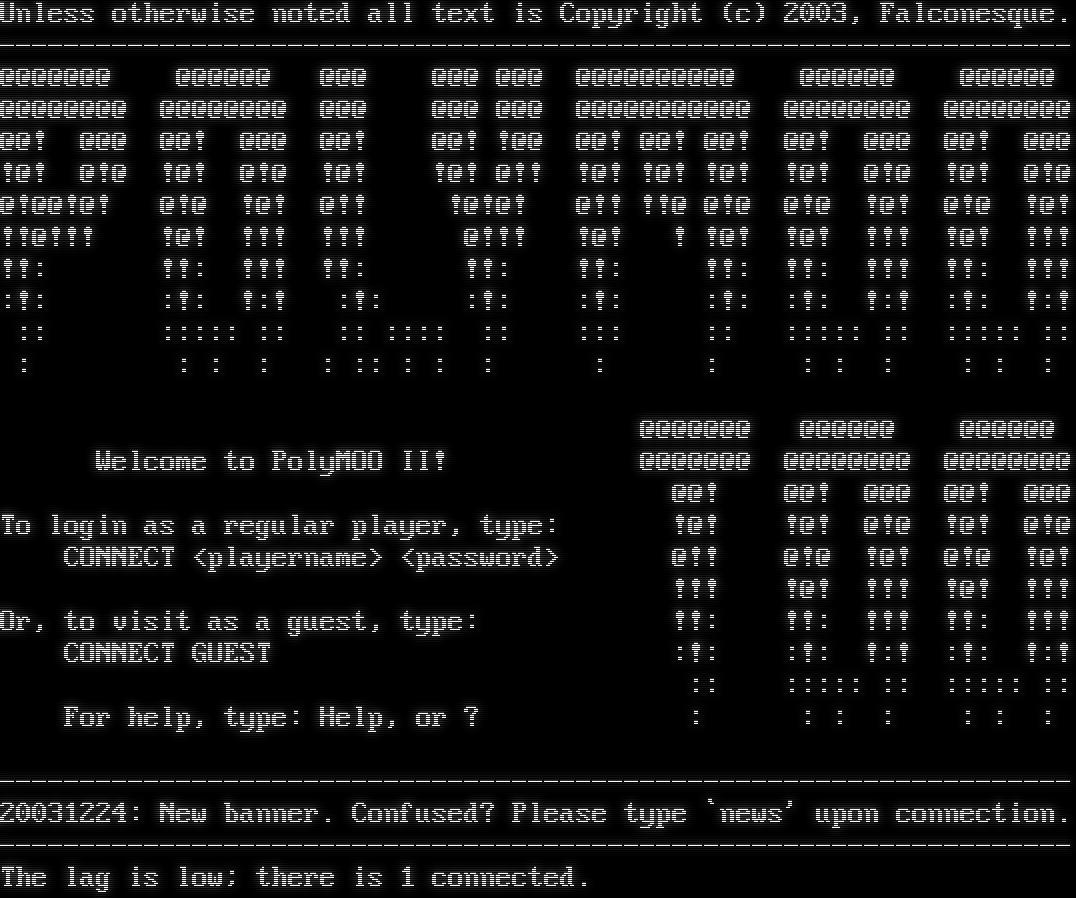 Unless otherwise noted all text is Copyright (c) 2003, Falconesque. -โ€‹------------------------------------------------------------------ @@@@@@@ @@@@@@ @@@ @@@ @@@ @@@@@@@@@@ @@@@@@ @@@@@@ @@@@@@@@ @@@@@@@@ @@@ @@@ @@@ @@@@@@@@@@@ @@@@@@@@ @@@@@@@@ @@! @@@ @@! @@@ @@! @@! !@@ @@! @@! @@! @@! @@@ @@! @@@ !@! @!@ !@! @!@ !@! !@! @!! !@! !@! !@! !@! @!@ !@! @!@ @!@@!@! @!@ !@! @!! !@!@! @!! !!@ @!@ @!@ !@! @!@ !@! !!@!!! !@! !!! !!! @!!! !@! ! !@! !@! !!! !@! !!! !!: !!: !!! !!: !!: !!: !!: !!: !!! !!: !!! :!: :!: !:! :!: :!: :!: :!: :!: !:! :!: !:! :: ::::: :: :: :::: :: ::: :: ::::: :: ::::: :: : : : : : :: : : : : : : : : : : : @@@@@@@ @@@@@@ @@@@@@ Welcome to PolyMOO II! @@@@@@@ @@@@@@@@ @@@@@@@@ @@! @@! @@@ @@! @@@ To login as a regular player, type: !@! !@! @!@ !@! @!@ CONNECT <playername> <password> @!! @!@ !@! @!@ !@! !!! !@! !!! !@! !!! Or, to visit as a guest, type: !!: !!: !!! !!: !!! CONNECT GUEST :!: :!: !:! :!: !:! :: ::::: :: ::::: :: For help, type: Help, or ? : : : : : : : -โ€‹------------------------------------------------------------------ 20031224: New banner. Confused? Please type \`news' upon connection. -โ€‹------------------------------------------------------------------ The lag is low; there is 1 connected.