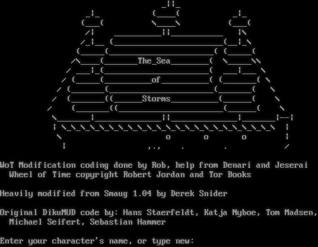 _\|\|_ _\|_ (_โ€‹___( _\|_ (___( \\_โ€‹___\\ (___( /\| _โ€‹_________\|\|_โ€‹__________ \|\\ /_\|__ (_โ€‹______________________(__\|_\\ (_โ€‹____(_โ€‹_____________________( (_โ€‹____( /\\_โ€‹___(_โ€‹______The_Sea_โ€‹_______( \\_โ€‹____\\\\ / ___\|_(_โ€‹_____________________( ___\|___ \\ / (_โ€‹____(_โ€‹_________of_โ€‹_________( (_โ€‹______( \\ / (_โ€‹______(_โ€‹_____________________(_โ€‹______( \\ / (_โ€‹______((_โ€‹_____Storms_โ€‹_________(_โ€‹_____( \\ / (_โ€‹______((_โ€‹_____________________(_โ€‹_____( \\ \\_โ€‹______\|_โ€‹_____________\|\|_โ€‹_____________\|_โ€‹______\|--\| \| \\_\\_\\_\\_\\_\\_\\_\\_\\_\\_\\_\\_\\_\\_\\_\\_\\_\\_\\_\\_\\_\\_\\ \| \\ o o o \| \| ,., . . / WoT Modification coding done by Rob, help from Denari and Jeserai Wheel of Time copyright Robert Jordan and Tor Books Heavily modified from Smaug 1.04 by Derek Snider Original DikuMUD code by: Hans Staerfeldt, Katja Nyboe, Tom Madsen, Michael Seifert, Sebastian Hammer Enter your character's name, or type new: