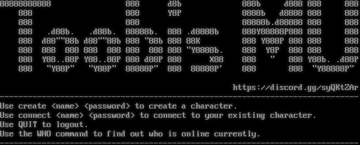 88888888888 888 d8b 888b d888 888 888 888 888 Y8P 8888b d8888 888 888 888 888 88888b.d88888 888 888 888 .d88b. .d88b. 88888b. 888 .d8888b 888Y88888P888 888 888 888 d88""88b d88""88b 888 "88b 888 88K 888 Y888P 888 888 888 888 888 888 888 888 888 888 888 "Y8888b. 888 Y8P 888 888 888 888 Y88..88P Y88..88P 888 d88P 888 X88 888 " 888 Y88b. .d88P 888 "Y88P" "Y88P" 88888P" 888 88888P' 888 888 "Y88888P" https://discord.gg/syQKtZAr -โ€‹---------------------------------------------------------------------------- Use create <name> <password> to create a character. Use connect <name> <password> to connect to your existing character. Use QUIT to logout. Use the WHO command to find out who is online currently. -โ€‹----------------------------------------------------------------------------