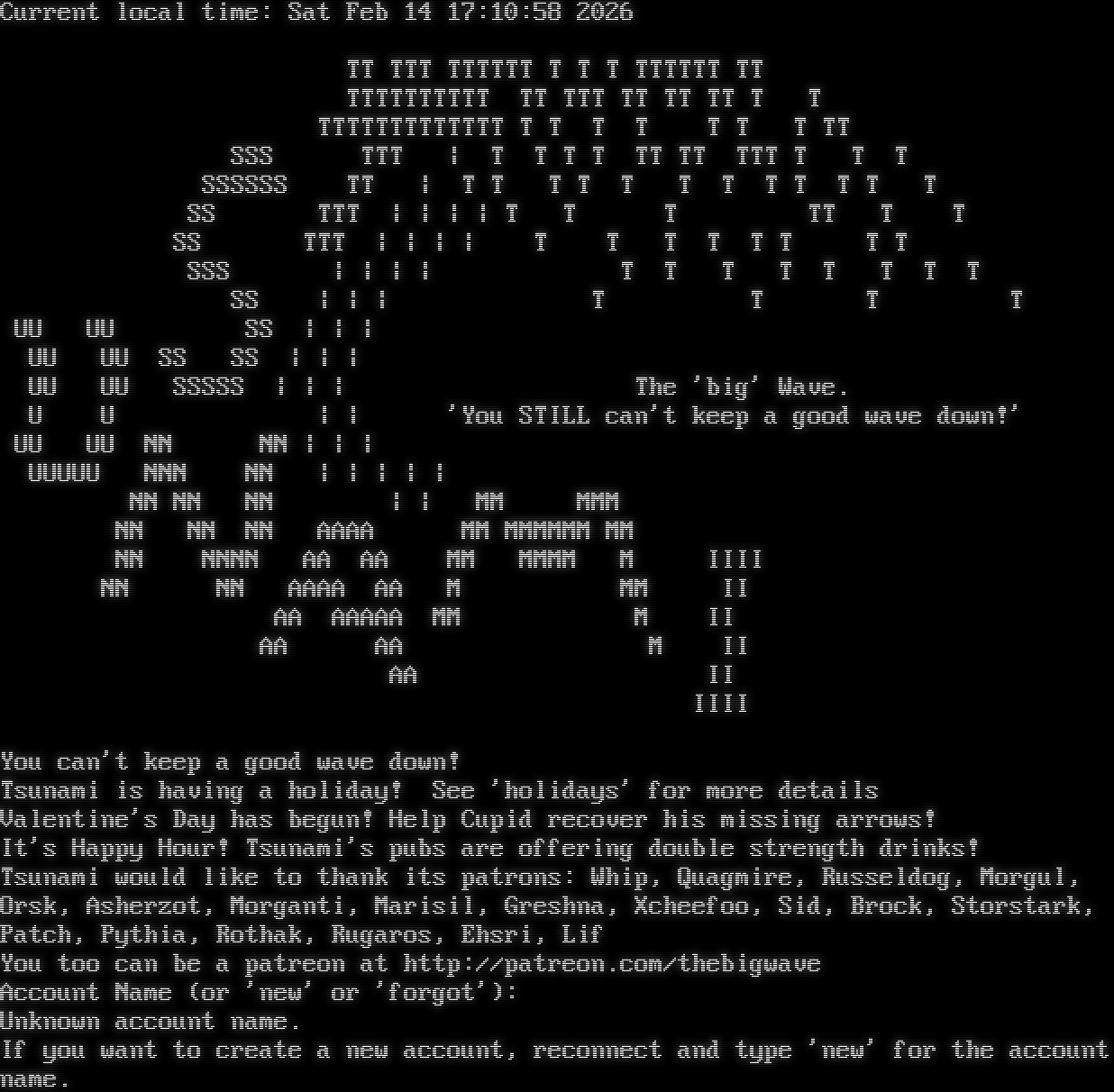 Current local time: Sat Feb 14 17:10:58 2026 TT TTT TTTTTT T T T TTTTTT TT TTTTTTTTTT TT TTT TT TT TT T T TTTTTTTTTTTTT T T T T T T T TT SSS TTT \| T T T T TT TT TTT T T T SSSSSS TT \| T T T T T T T T T T T T SS TTT \| \| \| \| T T T TT T T SS TTT \| \| \| \| T T T T T T T T SSS \| \| \| \| T T T T T T T T SS \| \| \| T T T T UU UU SS \| \| \| UU UU SS SS \| \| \| UU UU SSSSS \| \| \| The 'big' Wave. U U \| \| 'You STILL can't keep a good wave down!' UU UU NN NN \| \| \| UUUUU NNN NN \| \| \| \| \| NN NN NN \| \| MM MMM NN NN NN AAAA MM MMMMMM MM NN NNNN AA AA MM MMMM M IIII NN NN AAAA AA M MM II AA AAAAA MM M II AA AA M II AA II IIII You can't keep a good wave down! Tsunami is having a holiday! See 'holidays' for more details Valentine's Day has begun! Help Cupid recover his missing arrows! It's Happy Hour! Tsunami's pubs are offering double strength drinks! Tsunami would like to thank its patrons: Whip, Quagmire, Russeldog, Morgul, Orsk, Asherzot, Morganti, Marisil, Greshna, Xcheefoo, Sid, Brock, Storstark, Patch, Pythia, Rothak, Rugaros, Ehsri, Lif You too can be a patreon at http://patreon.com/thebigwave Account Name (or 'new' or 'forgot'): Unknown account name. If you want to create a new account, reconnect and type 'new' for the account name.