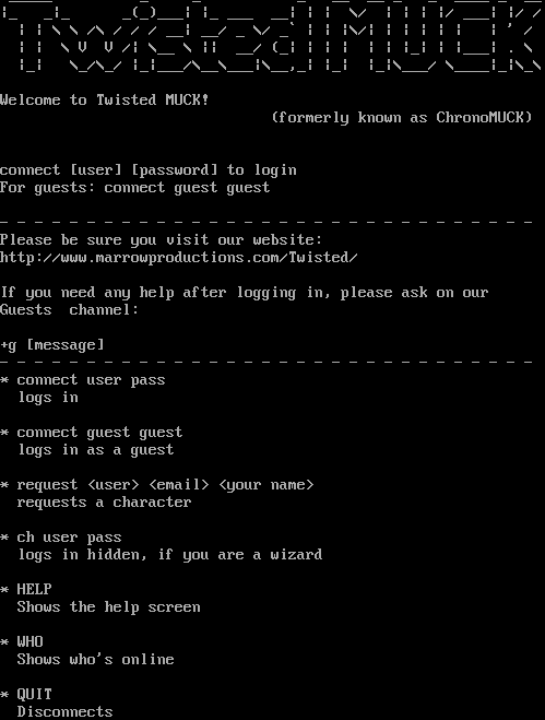 _​____ _ _ _ __ __ _ _ _​___ _ __ \|_ _\|_ _(_)___\| \|_ ___ __\| \| \| \\/ \| \| \| \|/ ___\| \|/ / \| \| \\ \\ /\\ / / / __\| __/ _ \\/ _\` \| \| \|\\/\| \| \| \| \| \| \| ' / \| \| \\ V V /\| \\__ \\ \|\| __/ (_\| \| \| \| \| \| \|_\| \| \|___\| . \\ \|_\| \\_/\\_/ \|_\|___/\\__\\___\|\\__,_\| \|_\| \|_\|\\___/ \\_​___\|_\|\\_\\ Welcome to Twisted MUCK! (formerly known as ChronoMUCK) connect [user] [password] to login For guests: connect guest guest - - - - - - - - - - - - - - - - - - - - - - - - - - - - - - - Please be sure you visit our website: http://www.marrowproductions.com/Twisted/ If you need any help after logging in, please ask on our Guests channel: +g [message] - - - - - - - - - - - - - - - - - - - - - - - - - - - - - - - \* connect user pass logs in \* connect guest guest logs in as a guest \* request <user> <email> <your name> requests a character \* ch user pass logs in hidden, if you are a wizard \* HELP Shows the help screen \* WHO Shows who's online \* QUIT Disconnects