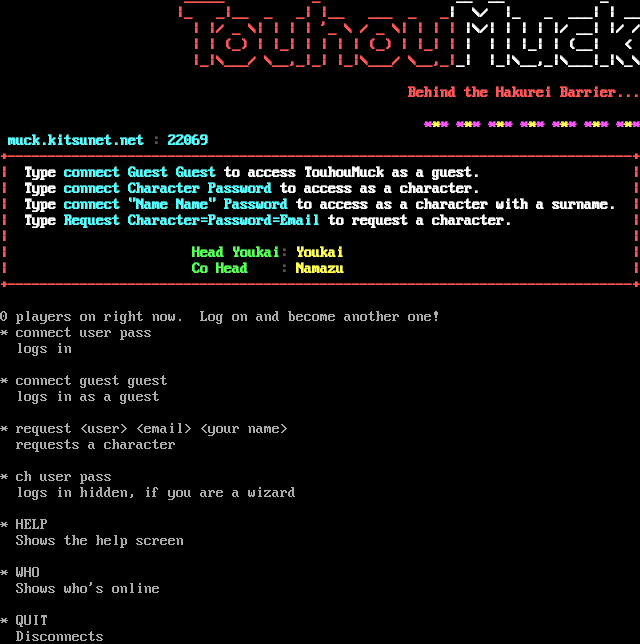 _​____ _ __ __ _ \|_ _\|__ _ _\| \|__ ___ _ _\| \\/ \|_ _ ___\| \| __ \| \|/ _ \\\| \| \| \| '_ \\ / _ \\\| \| \| \| \|\\/\| \| \| \| \|/ __\| \|/ / \| \| (_) \| \|_\| \| \| \| \| (_) \| \|_\| \| \| \| \| \|_\| \| (__\| < \|_\|\\___/ \\__,_\|_\| \|_\|\\___/ \\__,_\|_\| \|_\|\\__,_\|\\___\|_\|\\_\\ Behind the Hakurei Barrier... \*\*\* \*\*\* \*\*\* \*\*\* \*\*\* \*\*\* \*\*\* muck.kitsunet.net : 22069 +​------------------------------------------------------------------------------+ \| Type connect Guest Guest to access TouhouMuck as a guest. \| \| Type connect Character Password to access as a character. \| \| Type connect "Name Name" Password to access as a character with a surname. \| \| Type Request Character=Password=Email to request a character. \| \| \| \| Head Youkai: Youkai \| \| Co Head : Namazu \| +​------------------------------------------------------------------------------+ 0 players on right now. Log on and become another one! \* connect user pass logs in \* connect guest guest logs in as a guest \* request <user> <email> <your name> requests a character \* ch user pass logs in hidden, if you are a wizard \* HELP Shows the help screen \* WHO Shows who's online \* QUIT Disconnects