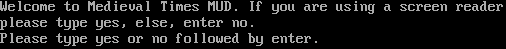 Welcome to Medieval Times MUD. If you are using a screen reader please type yes, else, enter no. Please type yes or no followed by enter.