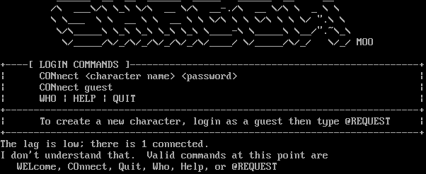 _​_____ __ __ _​_____ _​____ _​_____ __ __ /\\ ___\\/\\ \\_\\ \\/\\ __ \\/\\ _​_-./\\ __ \\/\\ \\ _ \\ \\ \\ \\___ \\ \\ __ \\ \\ __ \\ \\ \\/\\ \\ \\ \\/\\ \\ \\ \\/ ".\\ \\ \\/\\_​____\\ \\_\\ \\_\\ \\_\\ \\_\\ \\_​___-\\ \\_​____\\ \\__/".~\\_\\ \\/_​____/\\/_/\\/_/\\/_/\\/_/\\/_​___/ \\/_​____/\\/_/ \\/_/ MOO +​----[ LOGIN COMMANDS ]-​--------------------------------------------------+ \| CONnect <character name> <password> \| \| CONnect guest \| \| WHO \| HELP \| QUIT \| +​-------------------------------------------------------------------------+ \| To create a new character, login as a guest then type @REQUEST \| +​-------------------------------------------------------------------------+ The lag is low; there is 1 connected. I don't understand that. Valid commands at this point are WELcome, COnnect, Quit, Who, Help, or @REQUEST